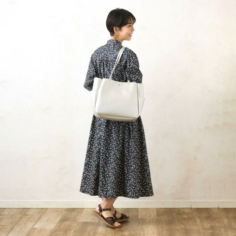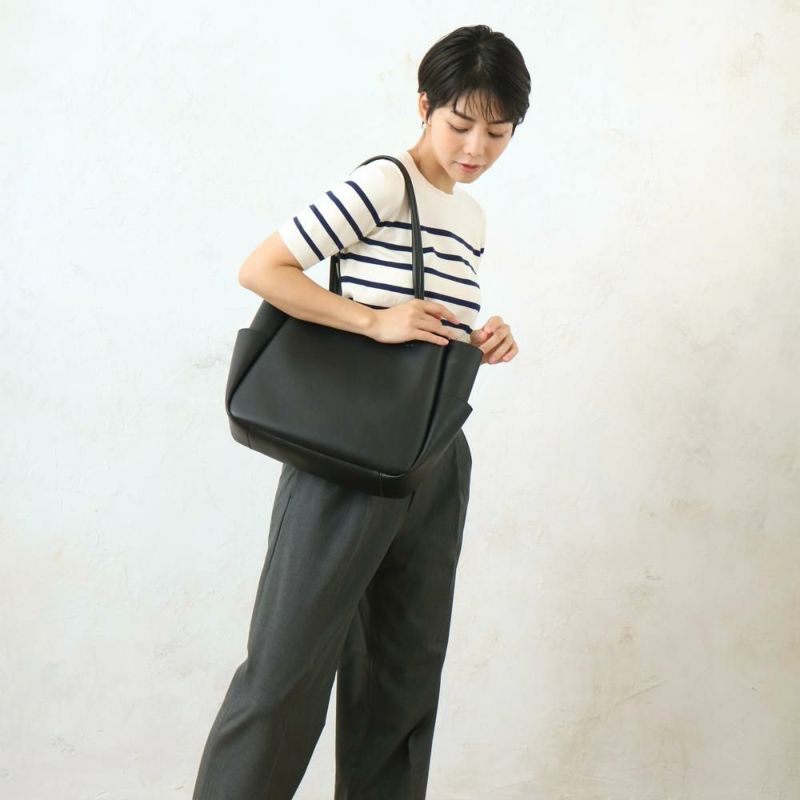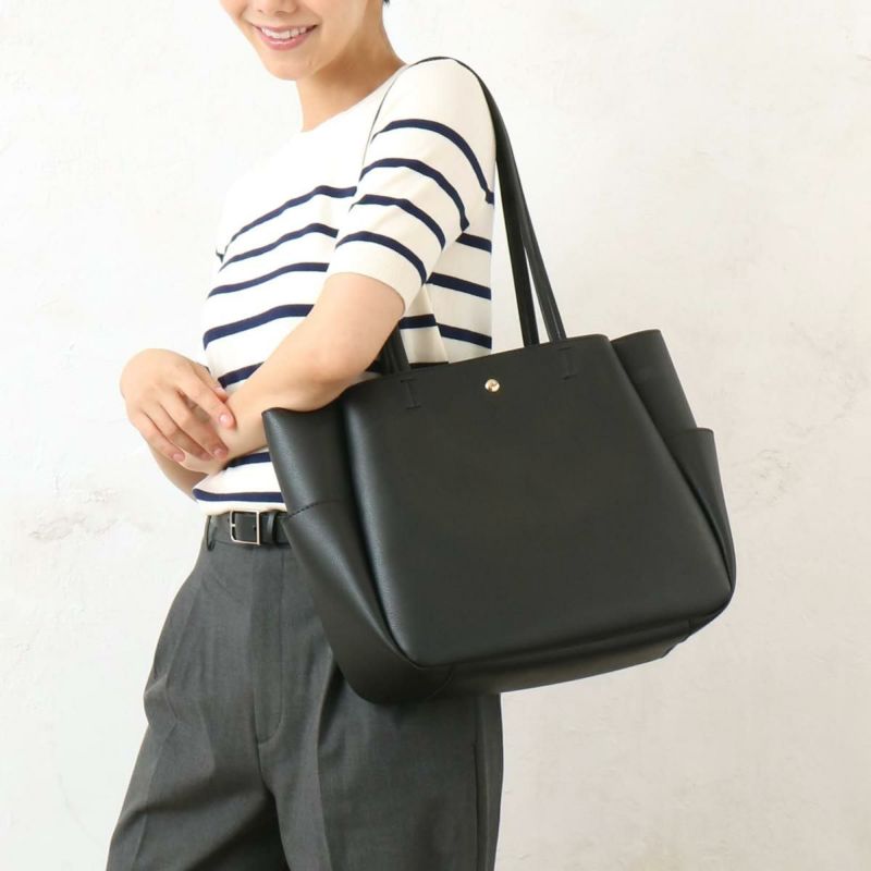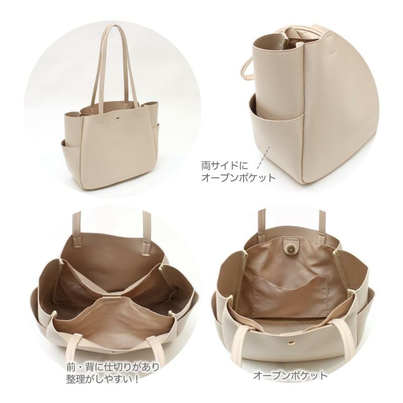 前・背に仕切りがあり荷物の定位置を決めて入れるだけで、簡単に整理ができるトートバッグです。軽量合皮を使用しているので、肩に掛けて持つときも身体に馴染みやすいアイテムです。通勤や通学に使うのはもちろん、デイリーにお使いいただけます。