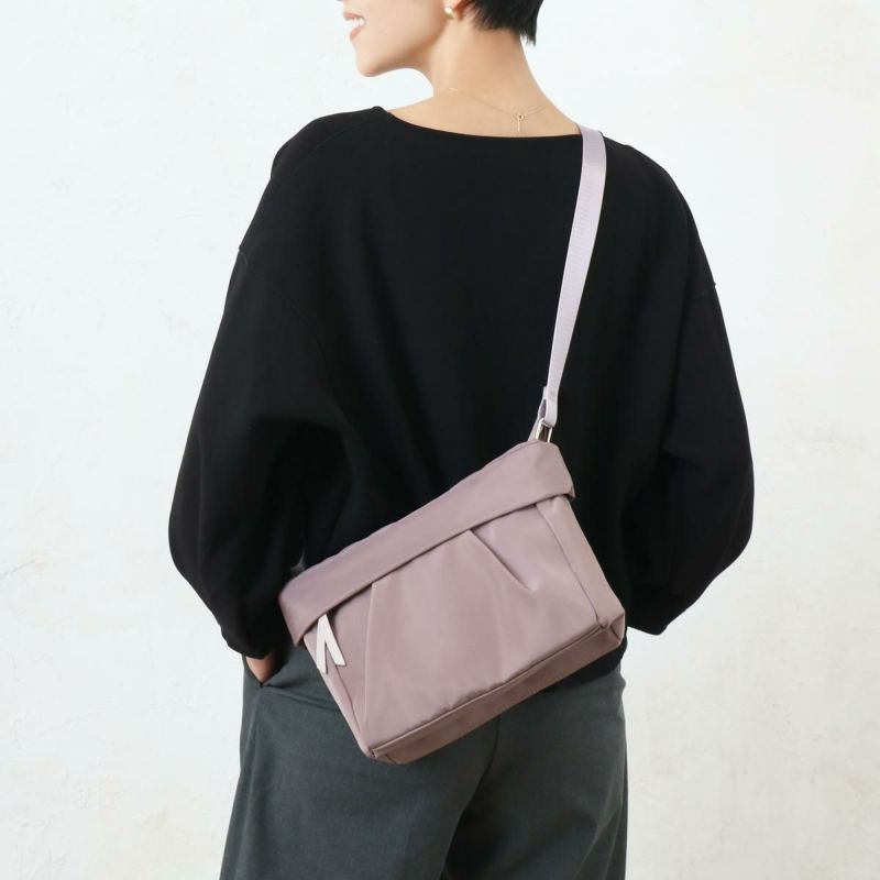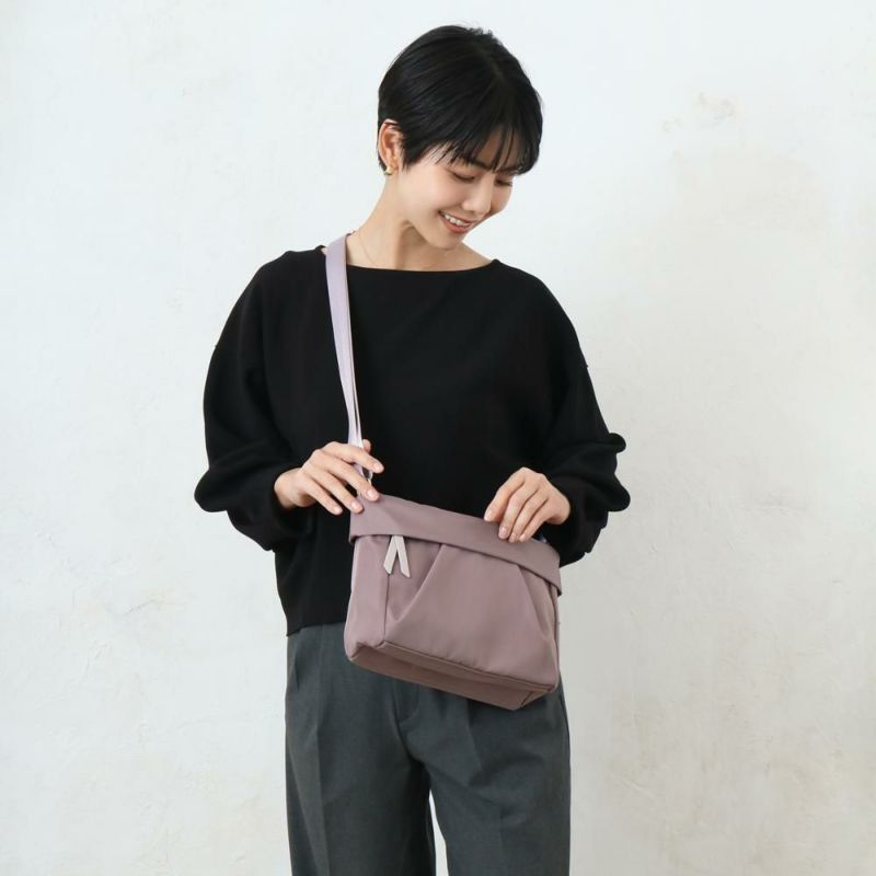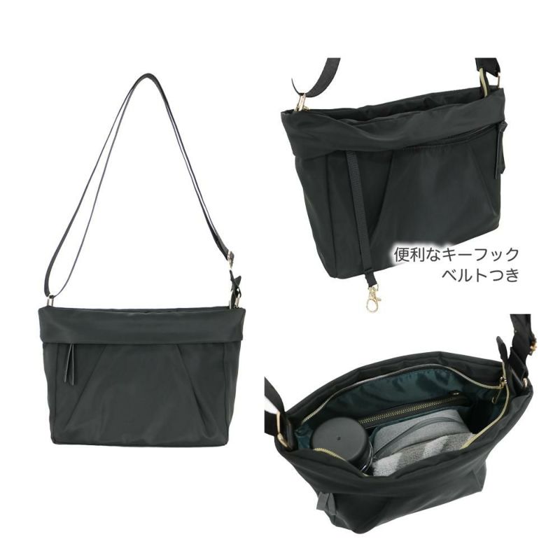 光沢生地を使った口折れデザインが特徴的なレイヤードショルダーです。レイヤード部分にはキーフック付きのファスナーポケットが程よいサイズ感で普段使いにぴったりなキレイ目ショルダーです。