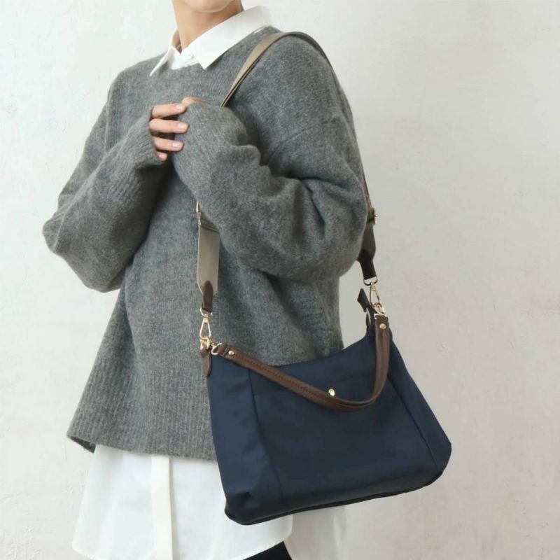 細かいシボ感がある合皮と光沢のあるポリ生地 を使用した2way仕様のショルダーバッグ。多様なポケット&ボトルホルダー付きで荷物をスッキリ収納。必需品をゆったり収納できるサイズ感で、旅行におおすすめ♪