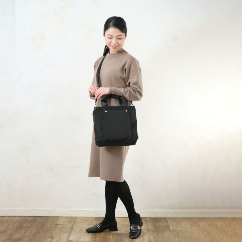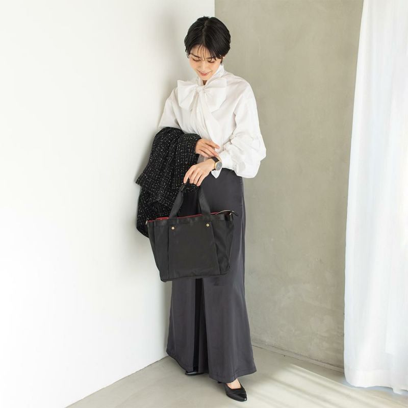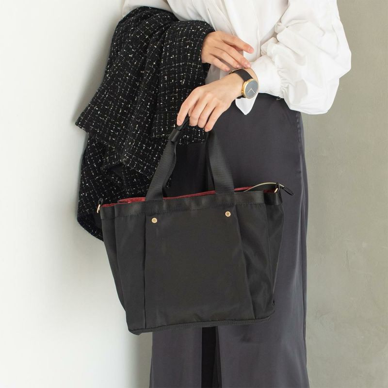 コーディネイトしやすく、これ一つでお出かけできるサイズ感。ポケットを豊富に配した機能的なアイテムです!リサイクルペットボトルからできた、環境に配慮した高密度ポリエステル生地を外側に使用。シンプルながら、タックを入れたフォルムがかわいらしくエレガントな印象に!しっかりとしたつくりなので、荷物を入れなくても自立します◎
