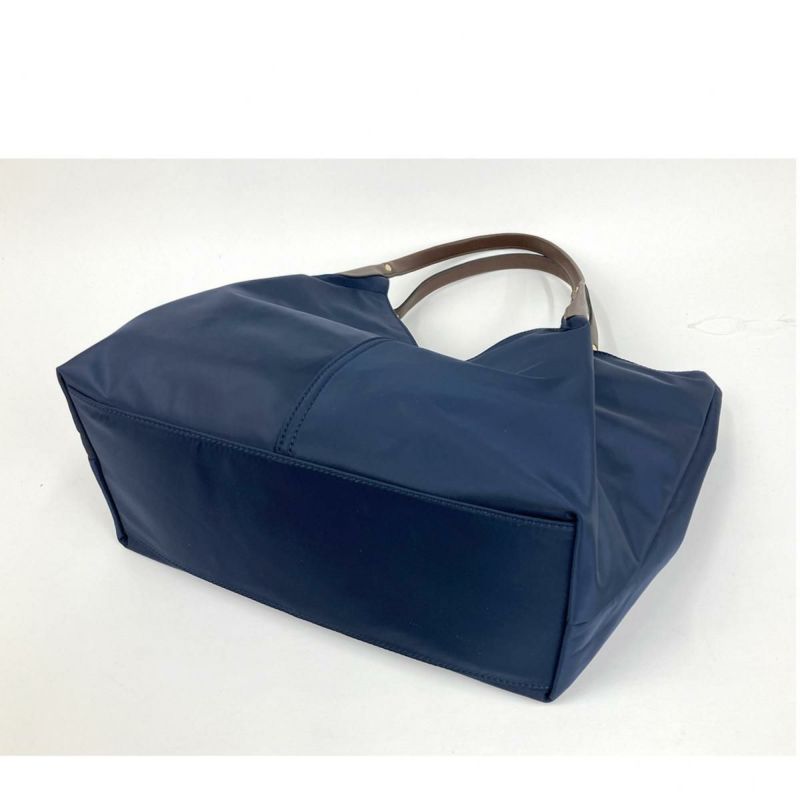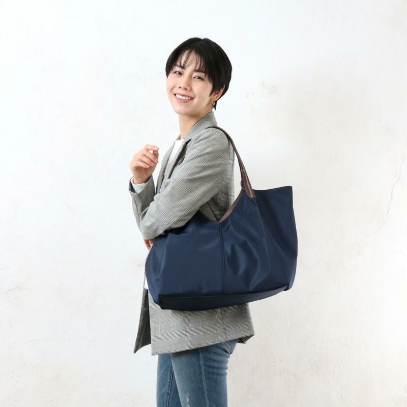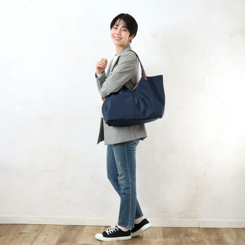 軽量で張りがある光沢ポリ生地と合皮をコンビ使いしたトートバッグ。個性的なVカットのデザインで、肩から持ちやすい長めハンドルで自立します。A4サイズ対応で、オンオフ使えて旅行にも便利なトートです
