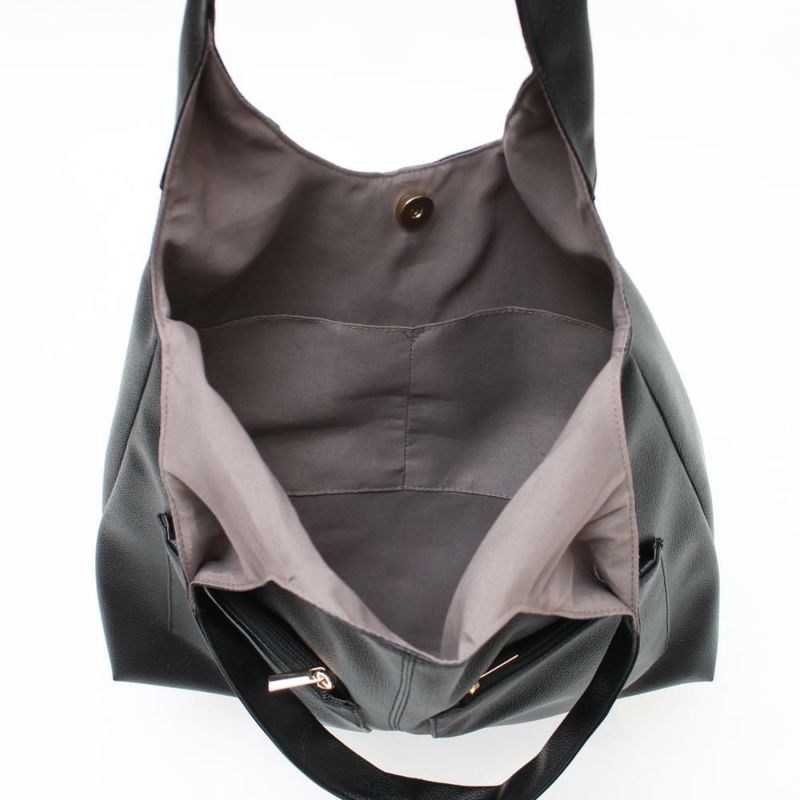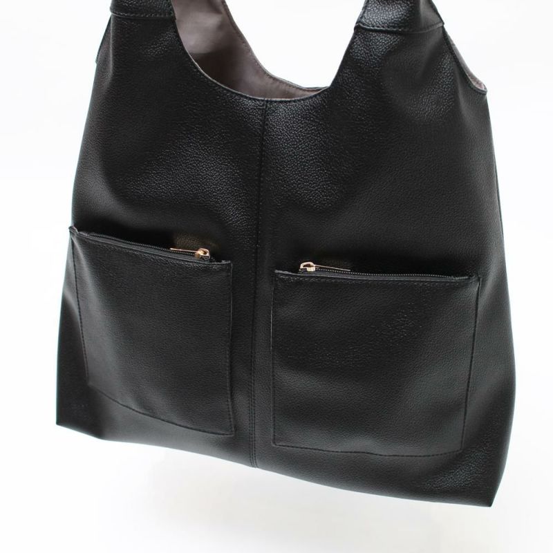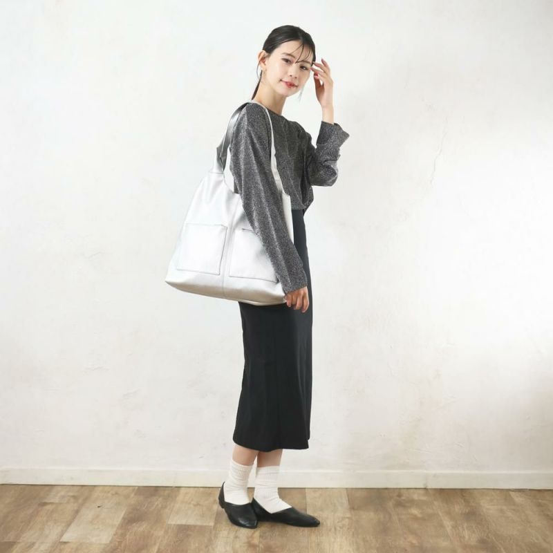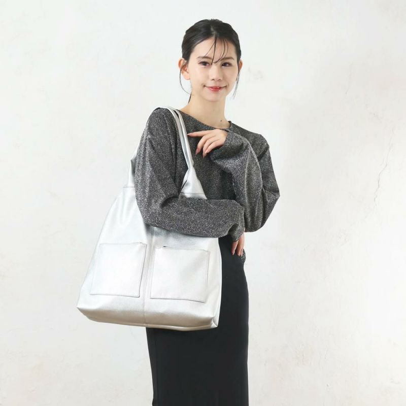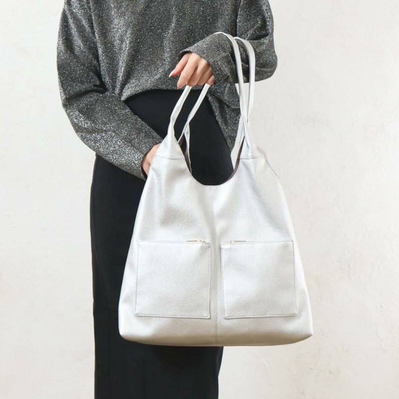 正面のスクエアポケットがポイントの合皮トートです。ファスナー付きアウトポケットは小物など迷子になりがちなものの収納に便利◎ラウンド型&ロングハンドルで肩掛けしやすいのも嬉しいポイントです!