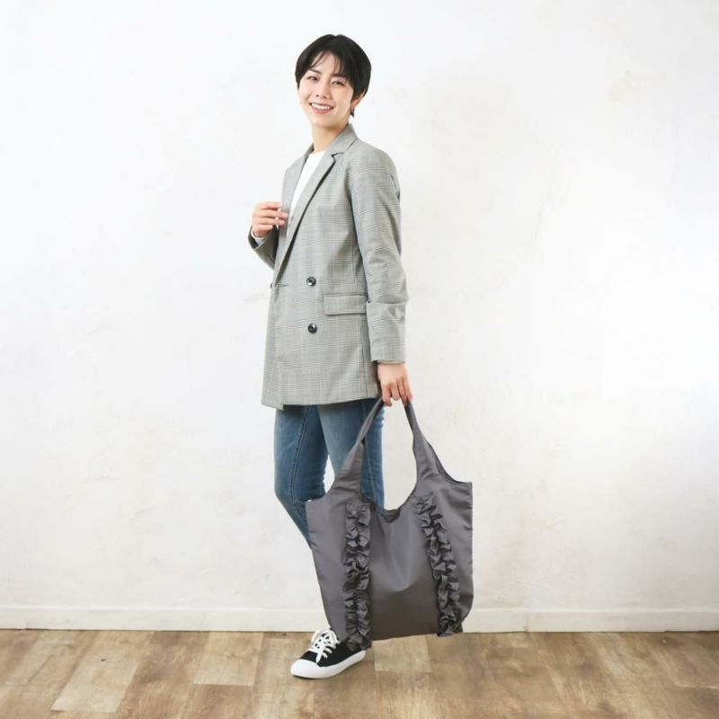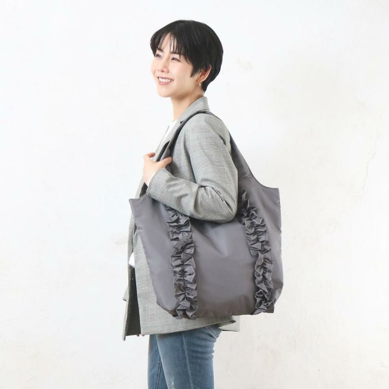 正面のフリルデザインは甘過ぎない控えめなボリューム感。軽量でA4収納可能なサイズ感はデイリーユース間違いなしのアイテムです。使いやすいクリ手デザインは肩掛けしやすい。