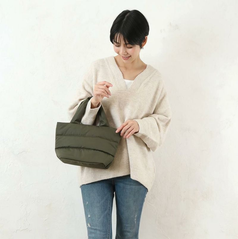 編み込み&ボーダーキルティングのダブルフェイス仕様で、コーデの幅が広がるトートバッグ。裏地にはエコ素材を使用し、必需品をまるっと収納できる便利なサイズ感でシャキッと自立します。秋冬コーデの主役になるようなアイコニックなバッグです♪