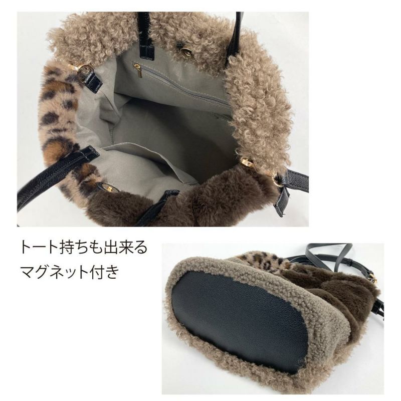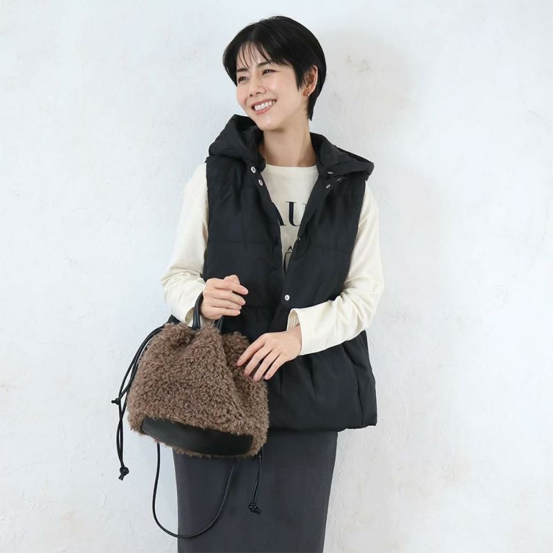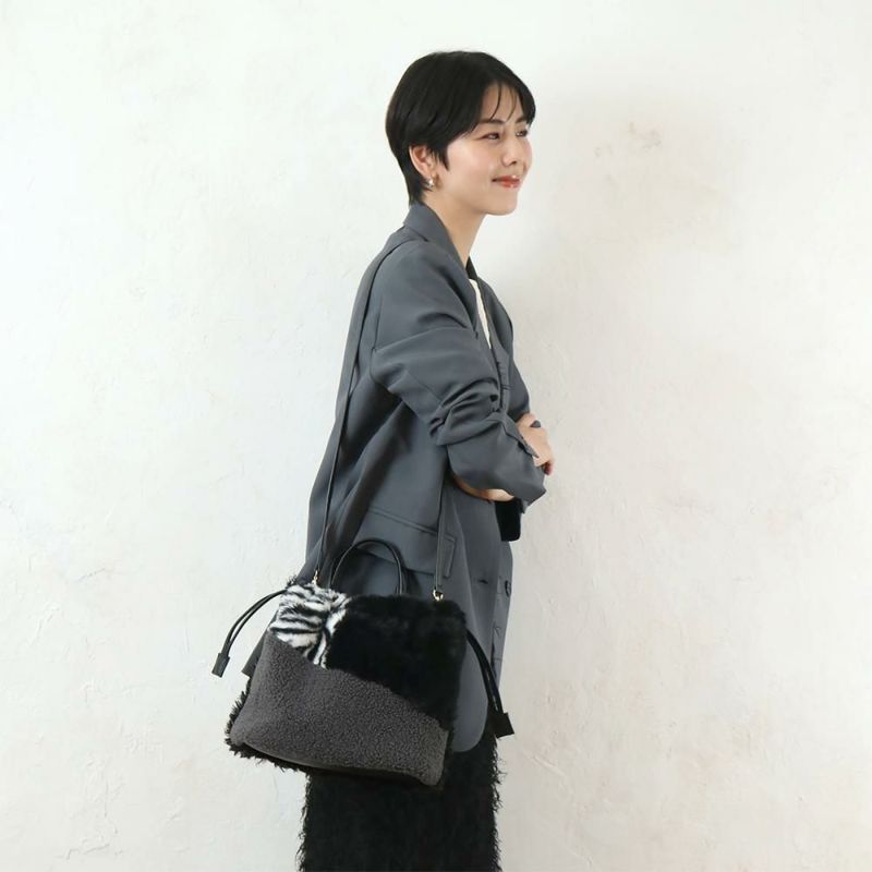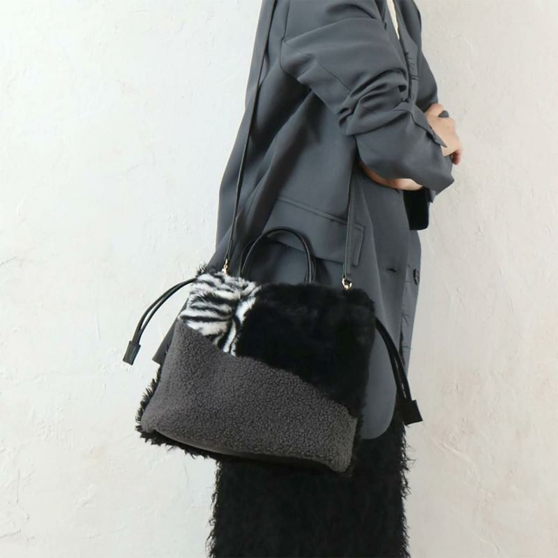 パズルのように様々なファーやボアを組み合わせた個性的な印象の巾着仕様のショルダーバッグ。背面は毛足の長い単色のプードルファーでシンプルに仕上げたWフェイス使いが可能です。トートとしても持てるマグネット付きで、秋冬コーデ主役級のアイコニックなバッグです♪