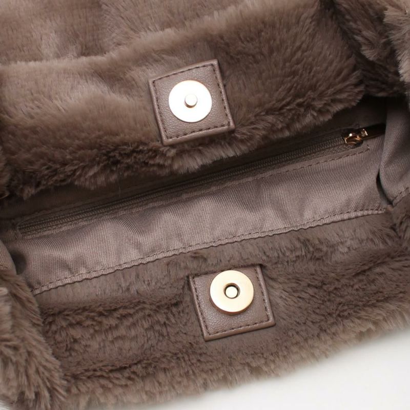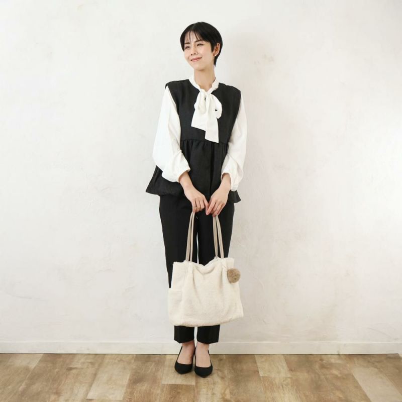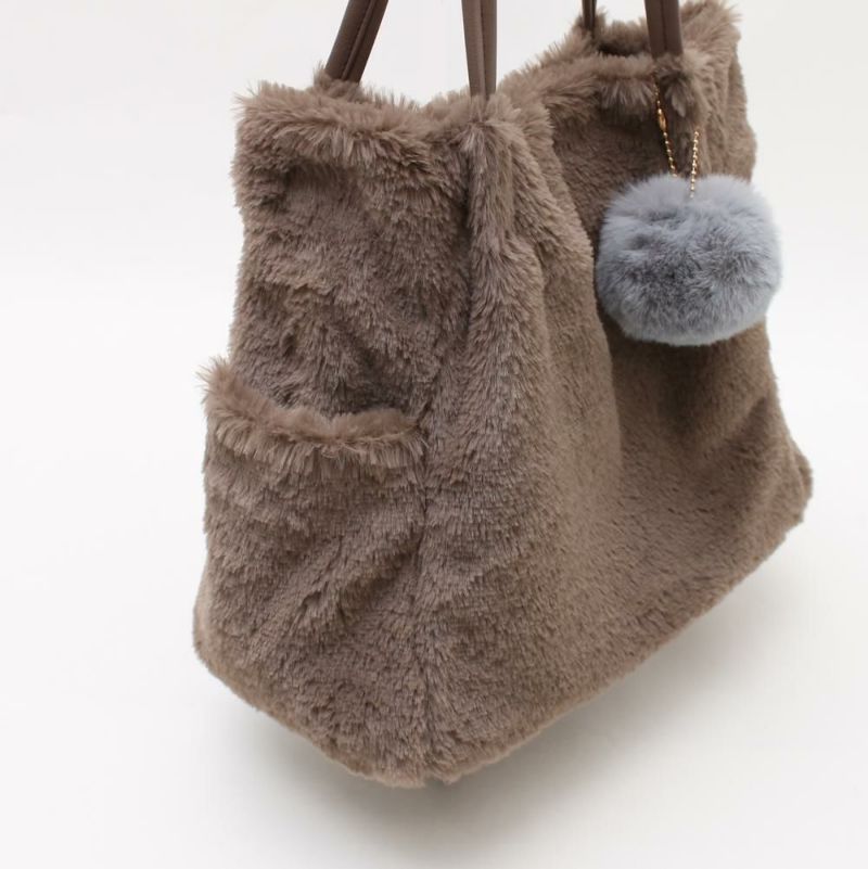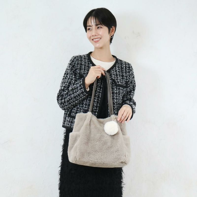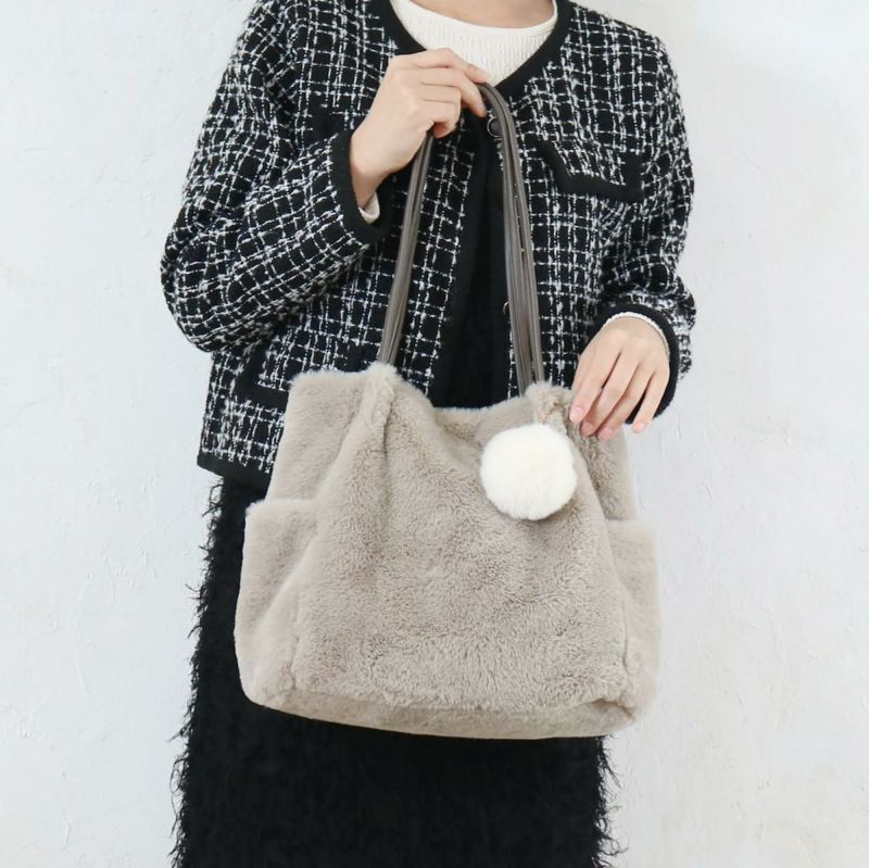 手触りの良いボリューム感のあるファーを使用したタック入りトートです。サイドや内装にもポケットが充実しておりAW素材バッグなのにとても機能的◎取り外し可能なファーポンポンチャームが華やかさをプラスしてくれます。