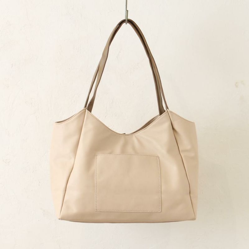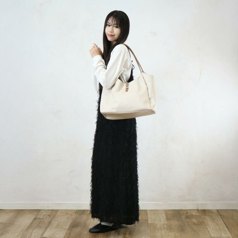 バイカラーデザインが目を引く、おしゃれな横型A4トートバッグ。飾りベルトが上品なアクセントを添え、ソフトな合皮素材が心地よい手触りです。A4ファイルもすっきりと収まり、通勤やデイリーユースに最適です◎