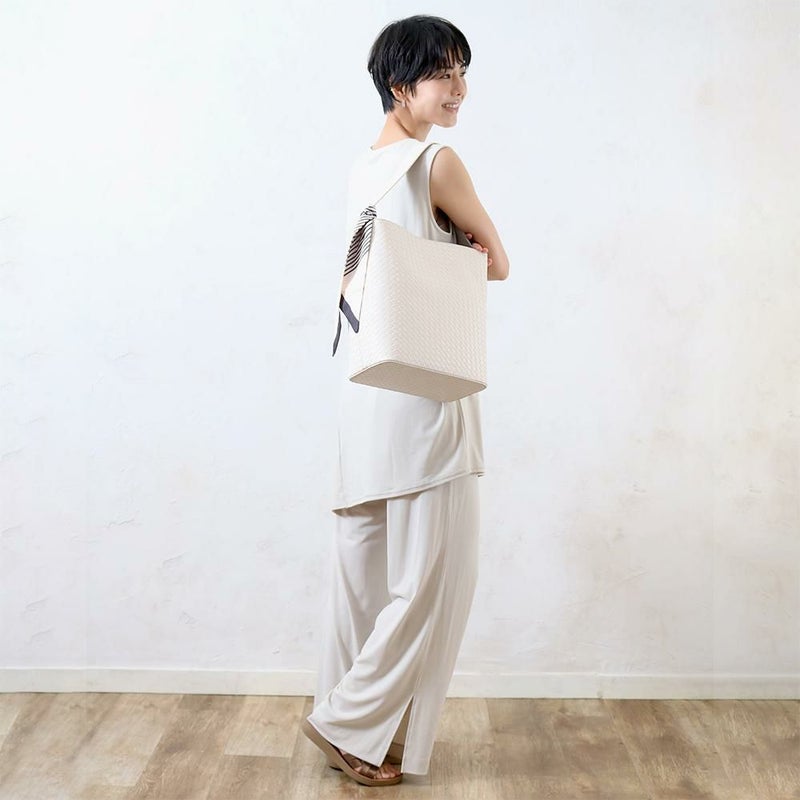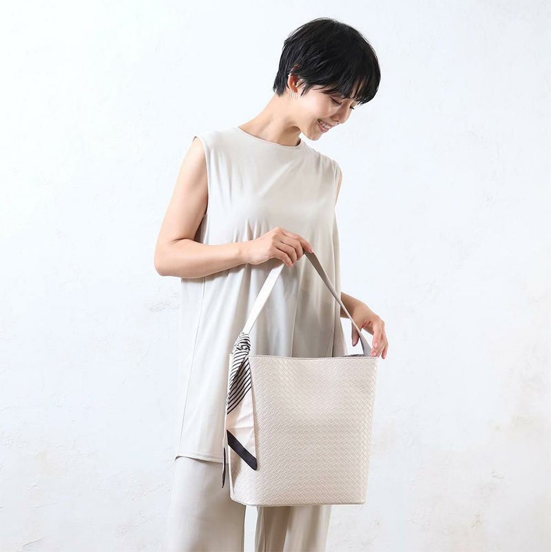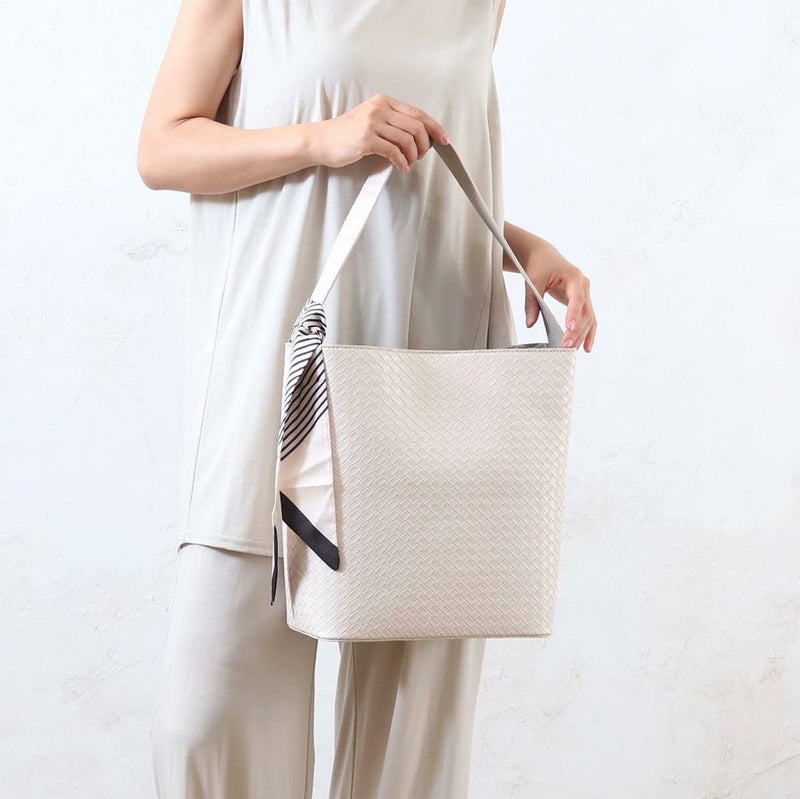 涼しげな印象の編み込みの型押しを施した合皮を使用した、バケツ型のショルダーバッグ。幅広マチで収納たっぷり。シャキッと自立するので荷物の出し入れがしやすい仕様。スカーフ付きで、さまざまなコーデに合わせやすい実用的なアイテムです♪