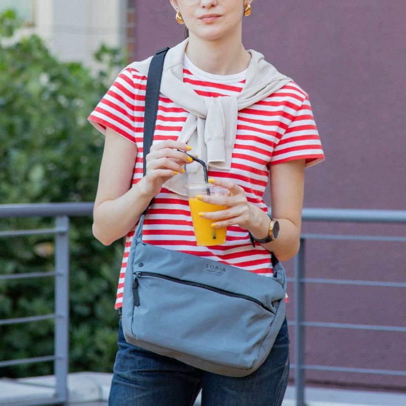 複数にひねった糸などを格子状に織り込んだ強度性の高いリップストップ生地を使ったショルダーバッグです。体にそう舟形で軽くて嬉しい撥水機能付き!