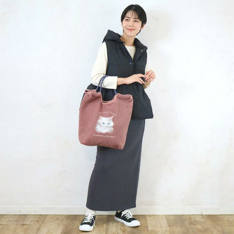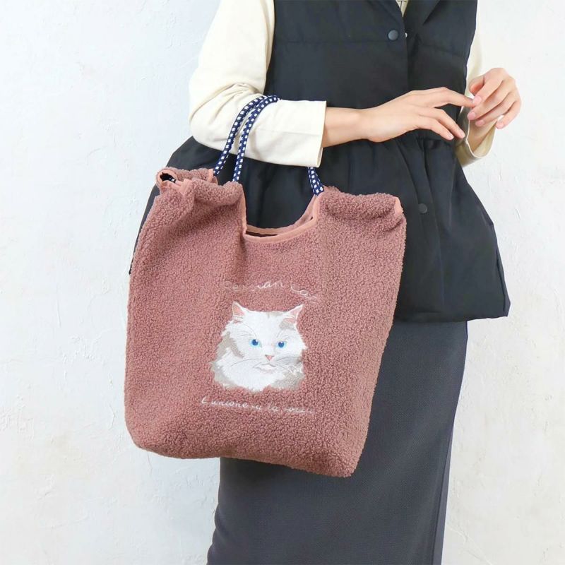 ボアに愛嬌のある表情の動物の刺繍がポイントのコードトート。柔らかいボアが体に沿ってくれるので持ちやすいです。