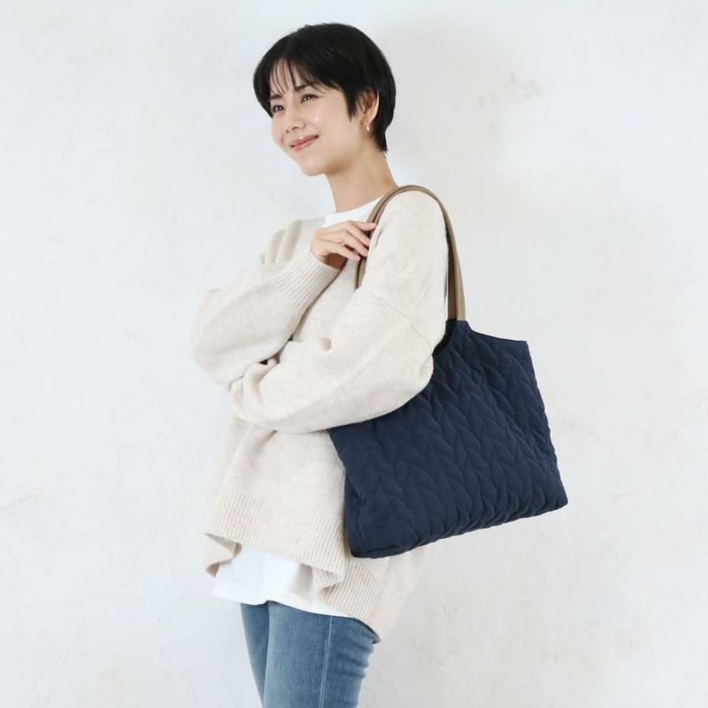リーフデザインのキルティングがポイントのA4トート。柔らかいマットな素材感でとても軽く、持ち手部分は合皮素材なので持ちやすく、日常使いにぴったり◎裏地にはエコ素材を使用しております。
