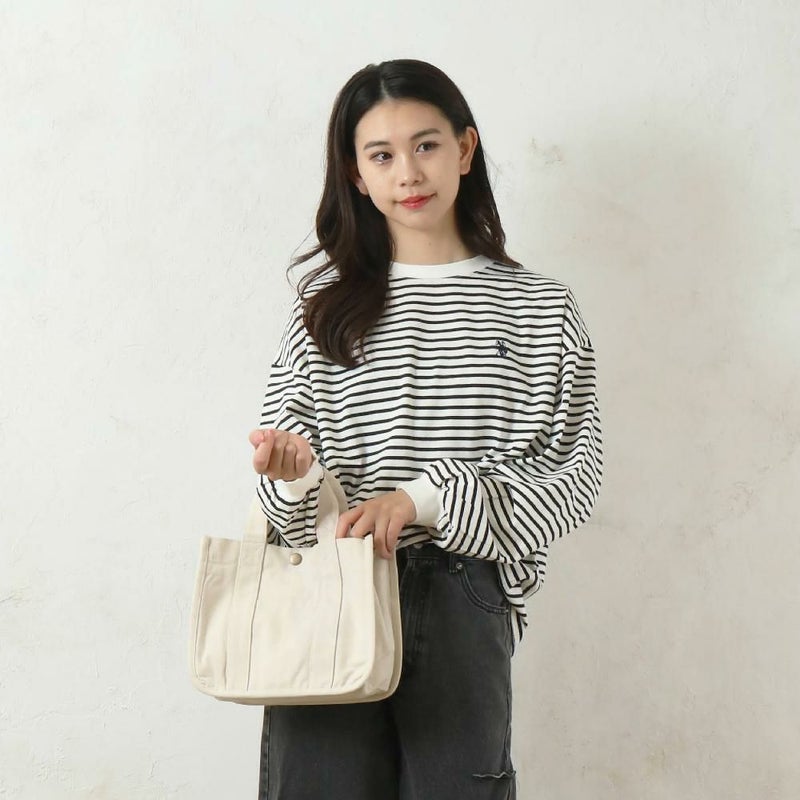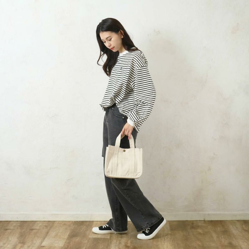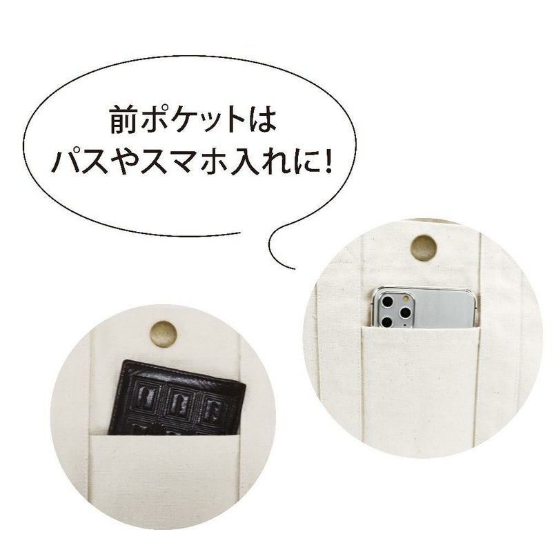 角が丸くて優しい印象のシンプルな帆布のトートです。ちょっとしたお出かけにも使いやすいサイズ感と、中の大きめポケットで荷物もスッキリ整理できます。