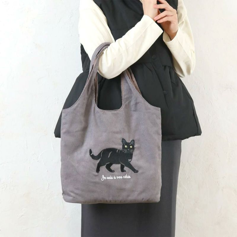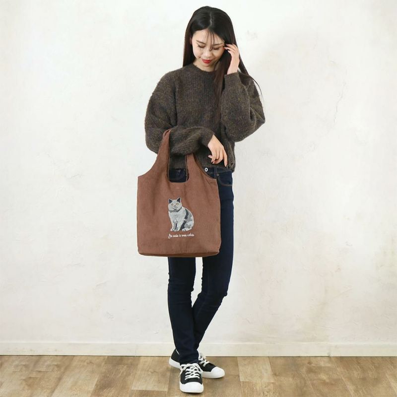 愛嬌のある表情が可愛い犬と猫の刺繍がポイントのコーデュロイバッグです。程よくくったり感があるので軽く畳んでサブバッグにも◎