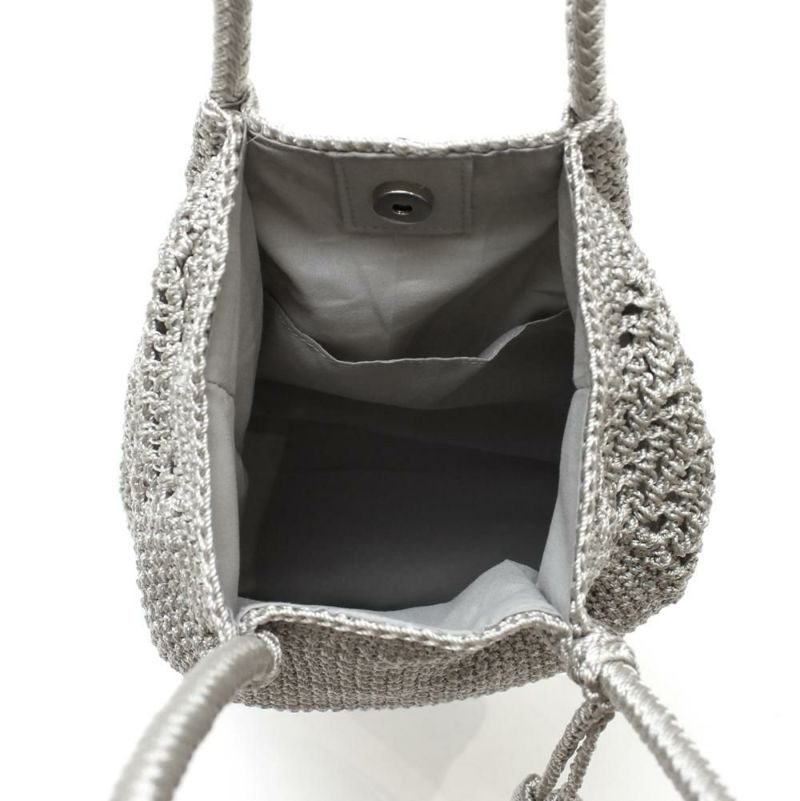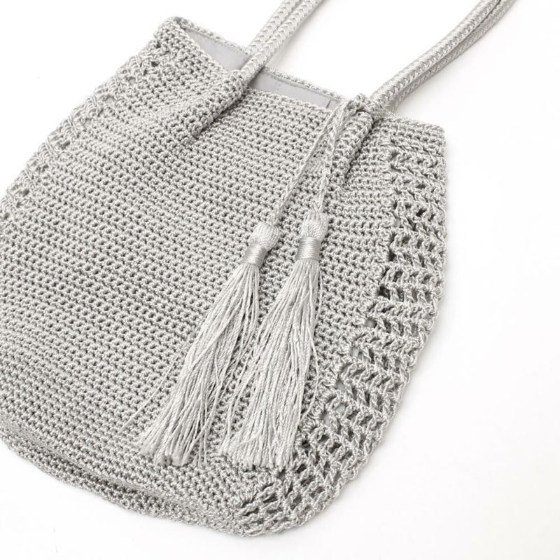 前後は細編み、サイドは透かし編みのデザインのコード編みトート。持ち手部分にはタックが入っている人気の形です。タッセルチャーム付きで高見えしコーディネートを引き立ててくれます。
