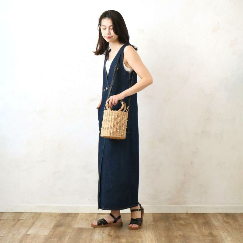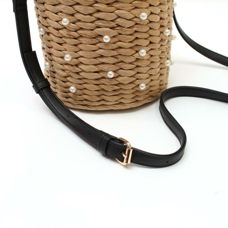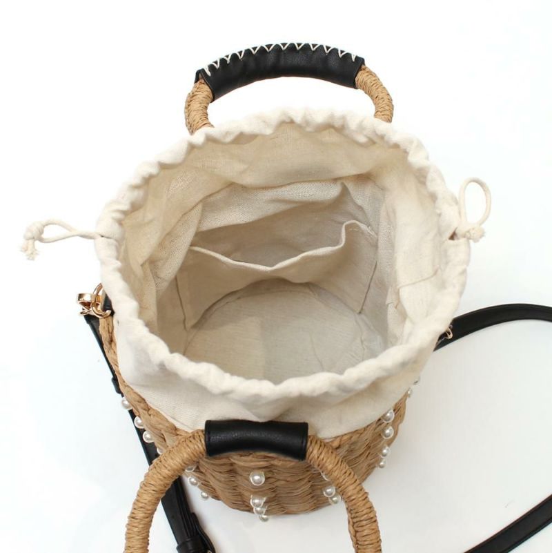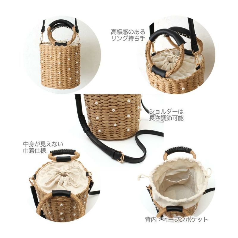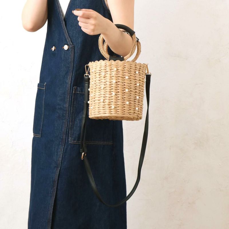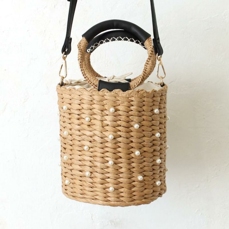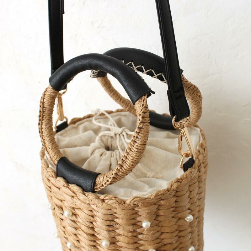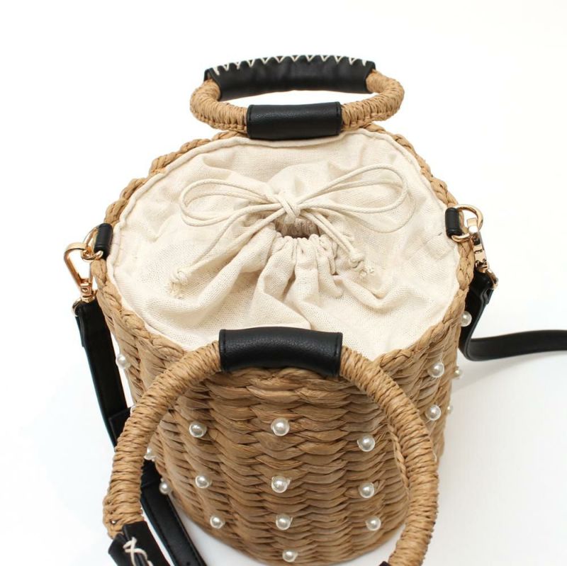 SSらしいアイキャッチなパールが付いたカゴバッグです。丸底で安定感もあり、実用性もばっちり兼ね備えてます。バッグの中が見えない巾着仕様も嬉しいポイントです!ショルダーは取り外し可能なので2wayで使用していただけます。
