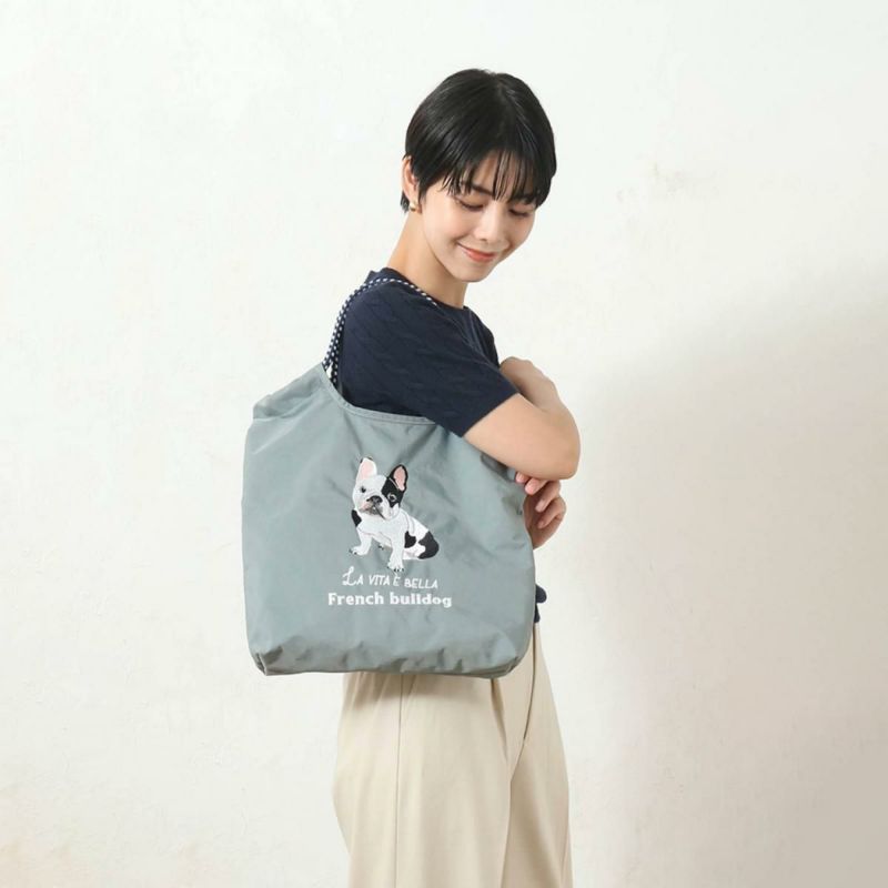 愛嬌のある表情が可愛い犬と猫の刺繍がポイントのコードトートです。コードは伸ばし方でショルダーにもなります。