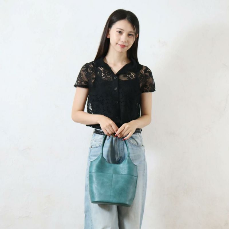 ナチュラルな素材と柔らかな色合いが魅力の、バケツ型トートバッグです。ころんとした丸みのあるフォルムが可愛らしく、持つだけでコーディネートに優しい雰囲気を加えてくれます。このバッグは見た目以上に収納力があり、長財布やポーチ、500mlペットボトルなどもすっきりと収まります。デイリーユースにぴったりのサイズ感で、ちょっとしたお出かけから、通勤・通学にもおすすめです。