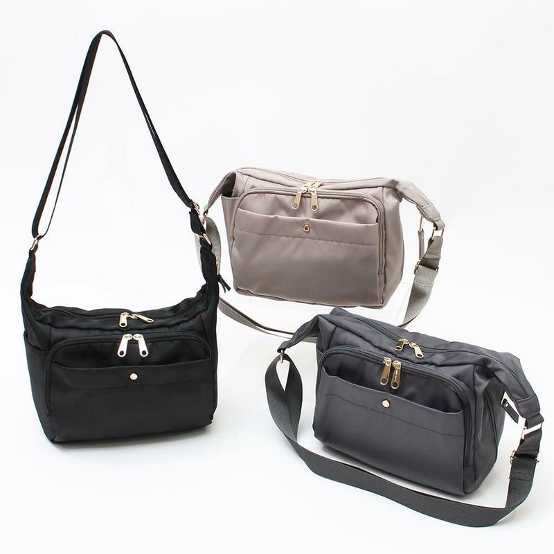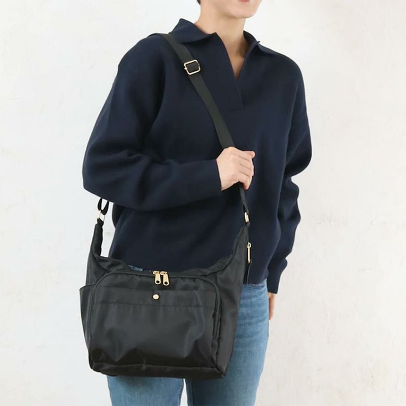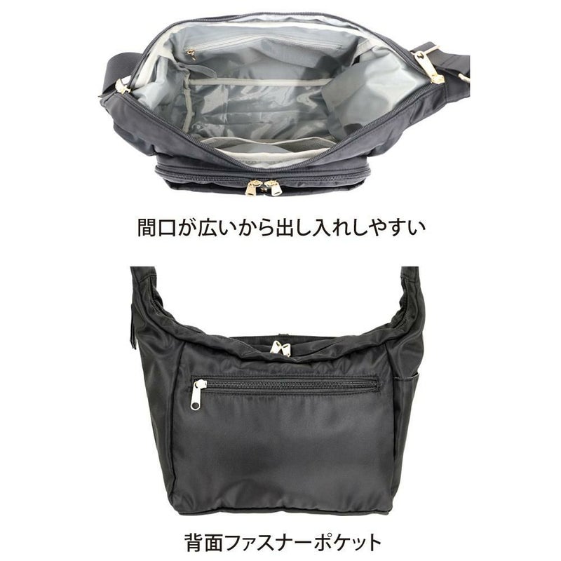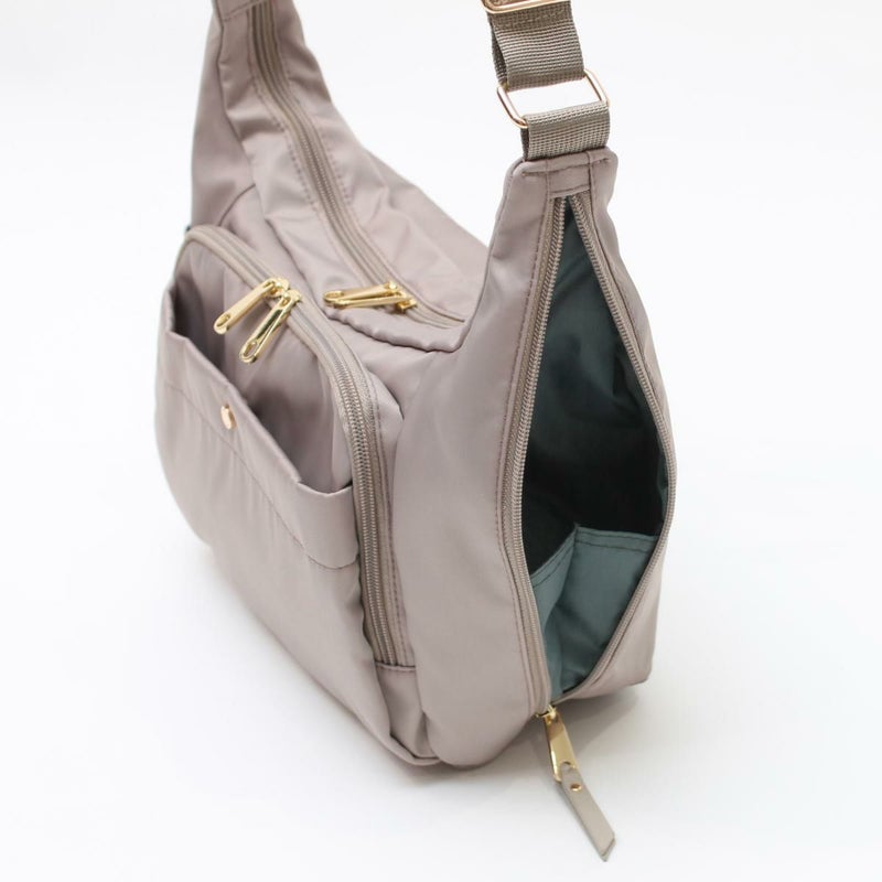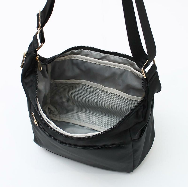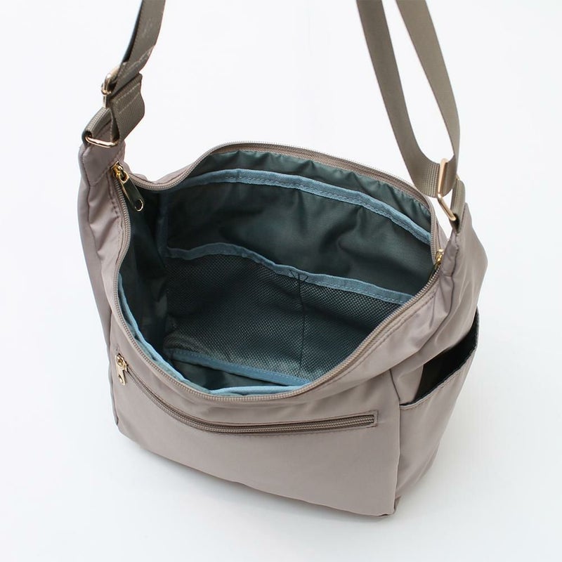 間口が広いので、お財布やエコバッグなどの出し入れがスムーズで、入れたはずの物が行方不明になりにくいのも便利です。サイドポケットに私は水筒と折りたたみ傘両方入れられたので、とても助かっています。全体的に使いやすく、実用性の高いショルダーバッグです。