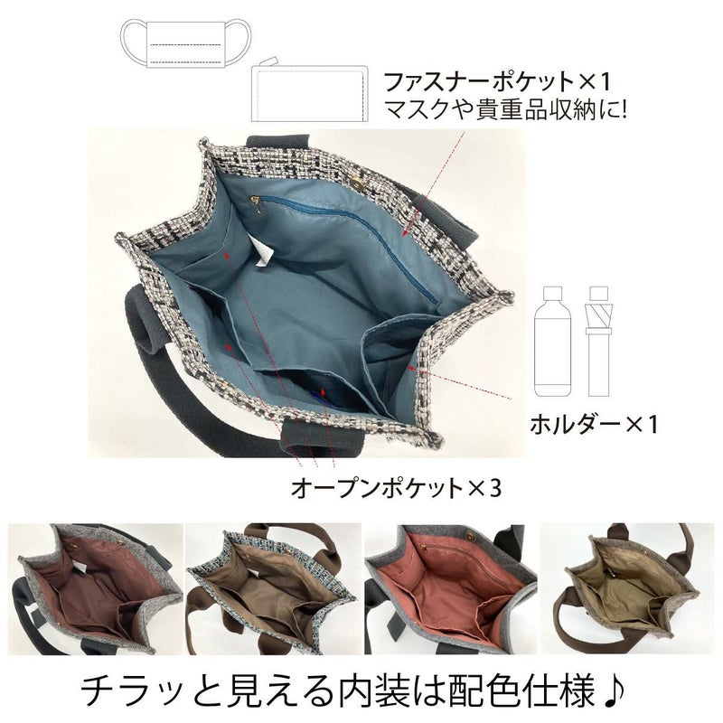 お客様の要望で復活したオッドハンドルトートの冬生地版が登場。大小6個のポケットとボトルや傘などの収納に便利なホルダーつきで整頓上手なトートです。 #0216