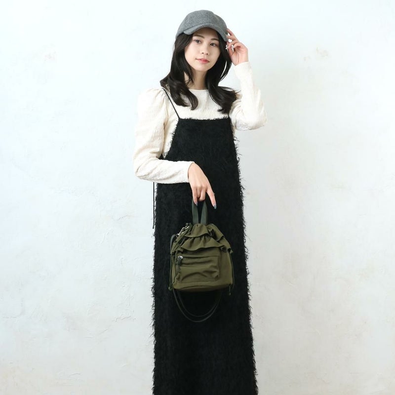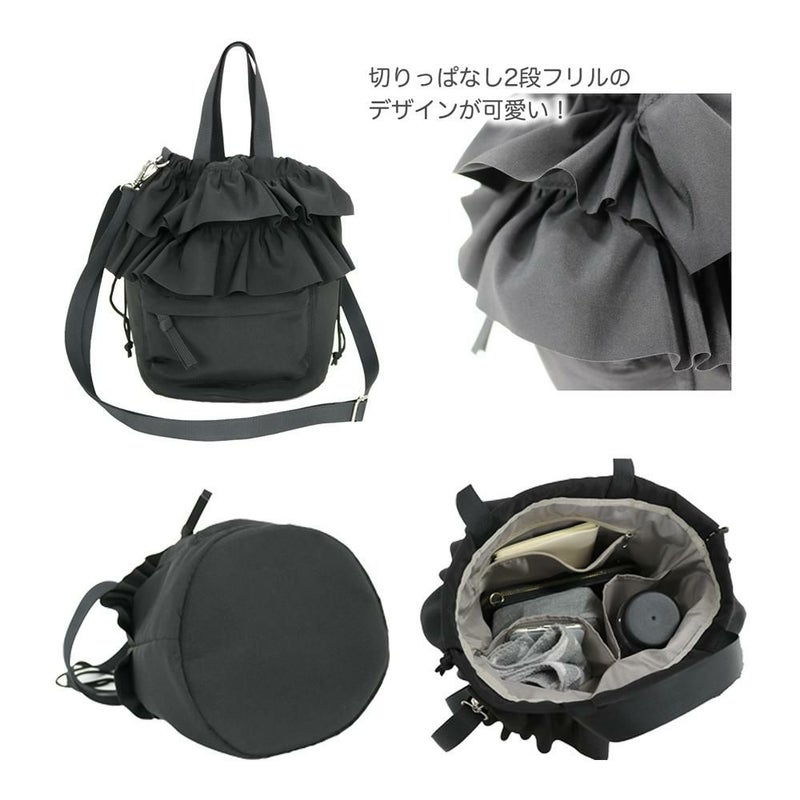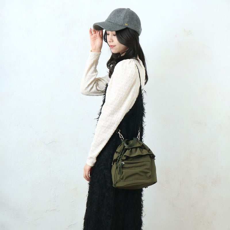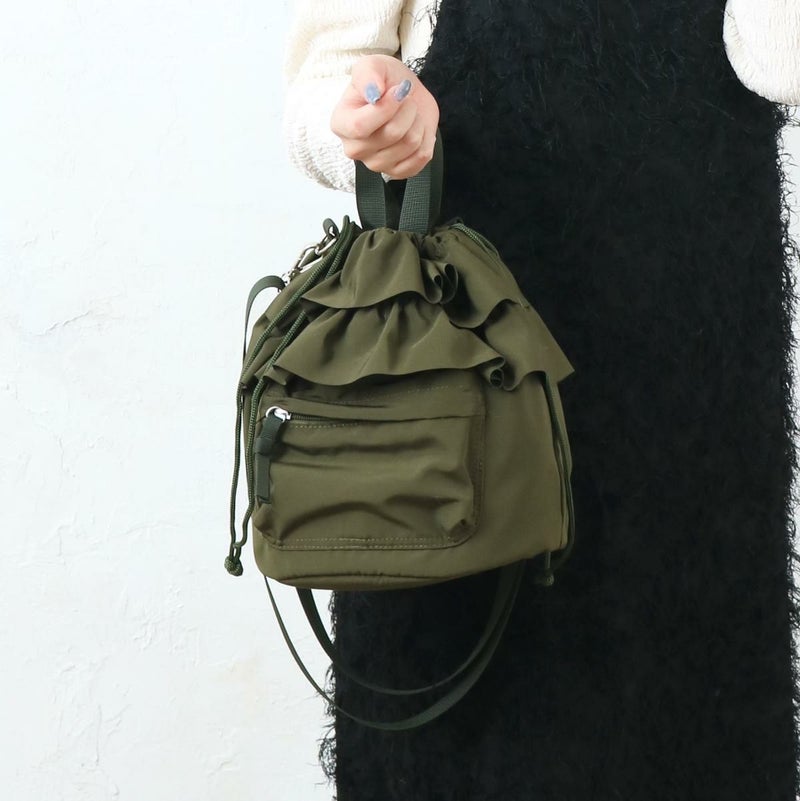 フリルデザインが目を引くドロストショルダーです。シンプルまコーデのアクセントにぴったりのトレンドデザインで見た目以上の収納力!裏地にはリサイクル生地を使用した環境にやさしい商品です。