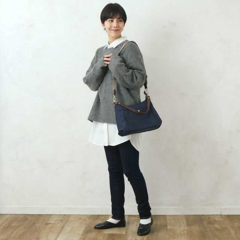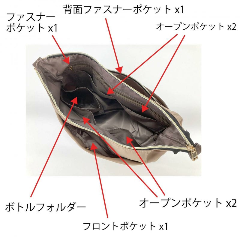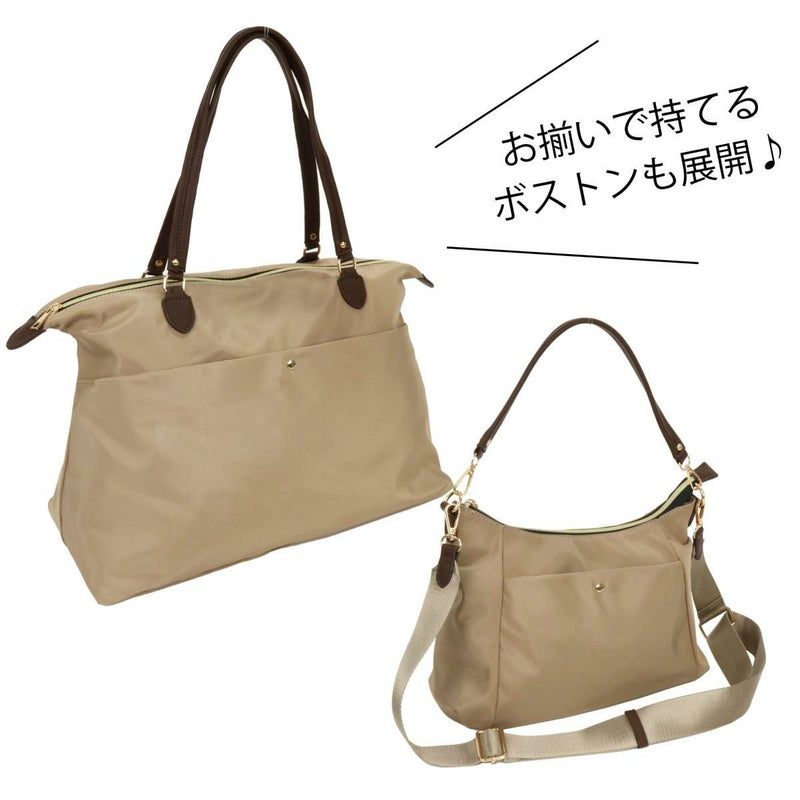 細かいシボ感がある合皮と光沢のあるポリ生地 を使用した2way仕様のショルダーバッグ。多様なポケット&ボトルホルダー付きで荷物をスッキリ収納。必需品をゆったり収納できるサイズ感で、旅行におおすすめ♪