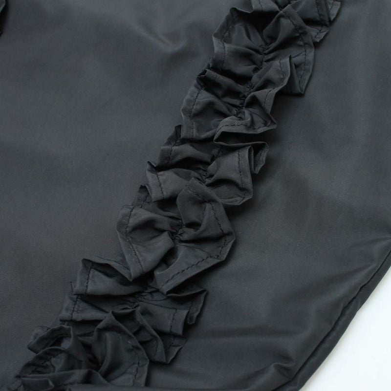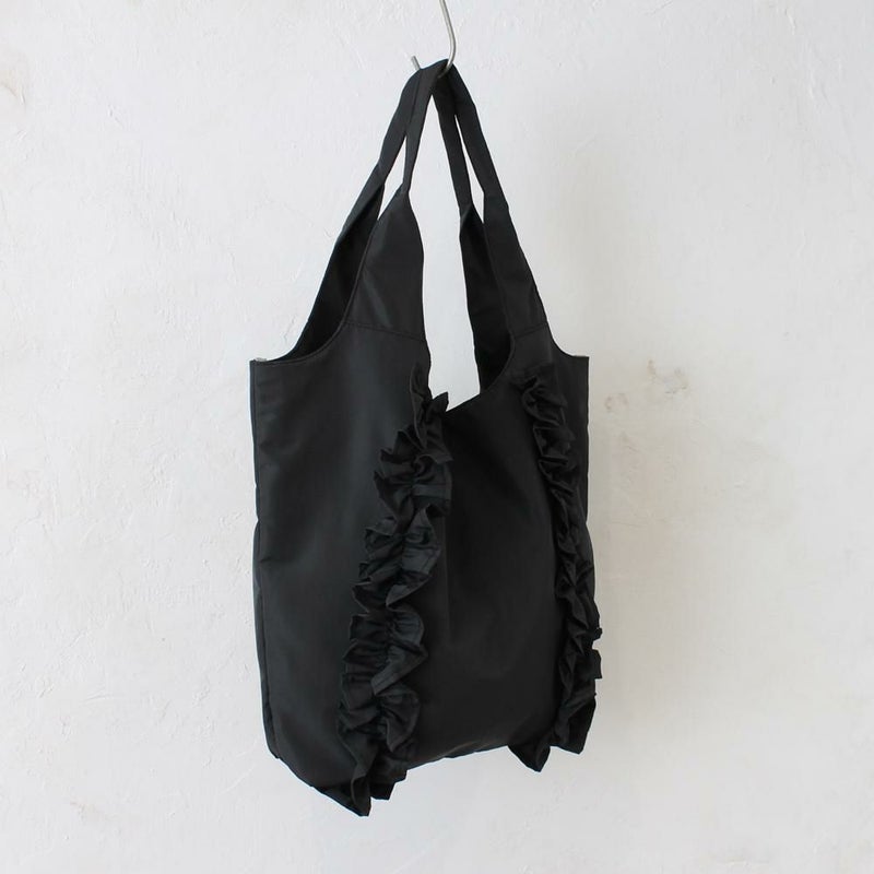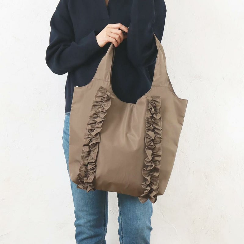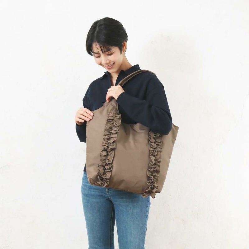 正面のフリルデザインは甘過ぎない控えめなボリューム感。軽量でA4収納可能なサイズ感はデイリーユース間違いなしのアイテムです。使いやすいクリ手デザインは肩掛けしやすい。