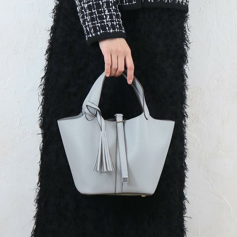 軽くて張りがある細やかなシボ系合皮を使用した、タッセル付きで上品な印象のトートバッグ。幅広マチで、小振りながらも必需品はしっかり収納できる便利なサイズ感です。シンプルなデザインで、季節を問わずスタイリングしやすいプチプラバッグです♪