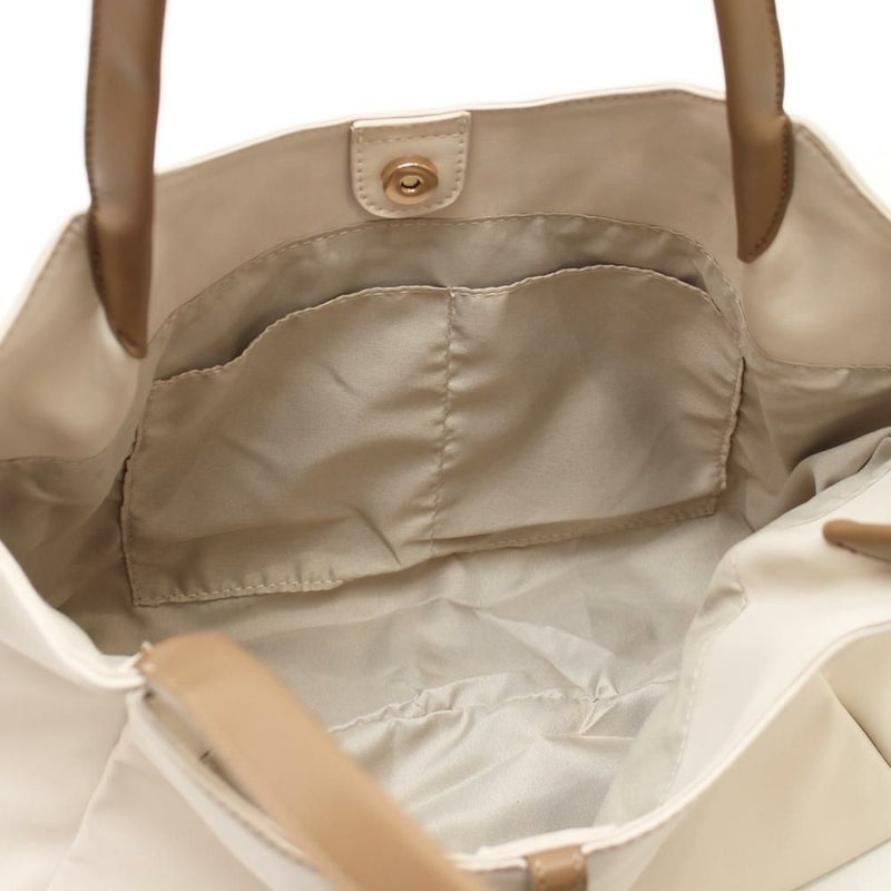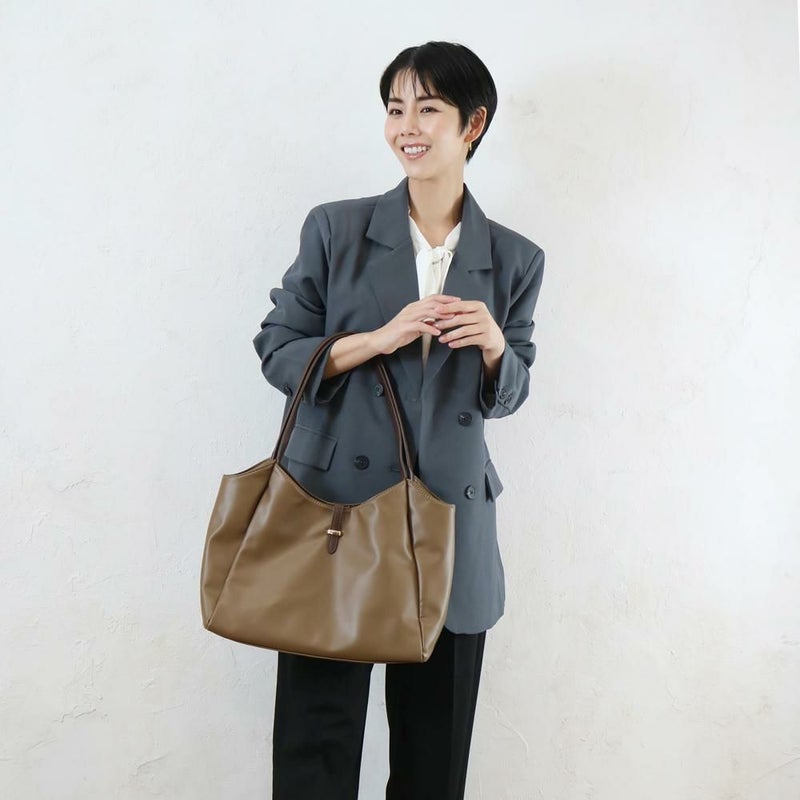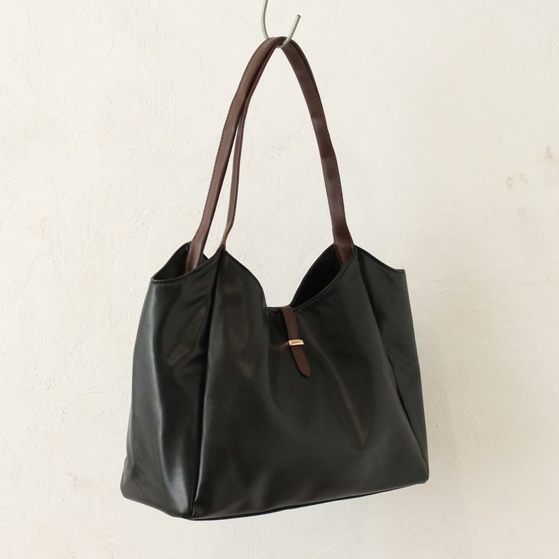 バイカラーデザインが目を引く、おしゃれな横型A4トートバッグ。飾りベルトが上品なアクセントを添え、ソフトな合皮素材が心地よい手触りです。A4ファイルもすっきりと収まり、通勤やデイリーユースに最適です◎