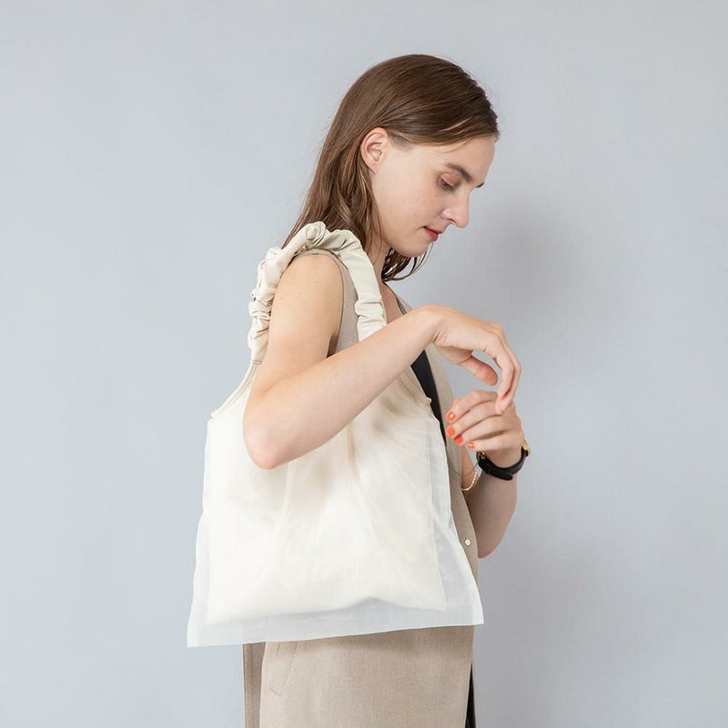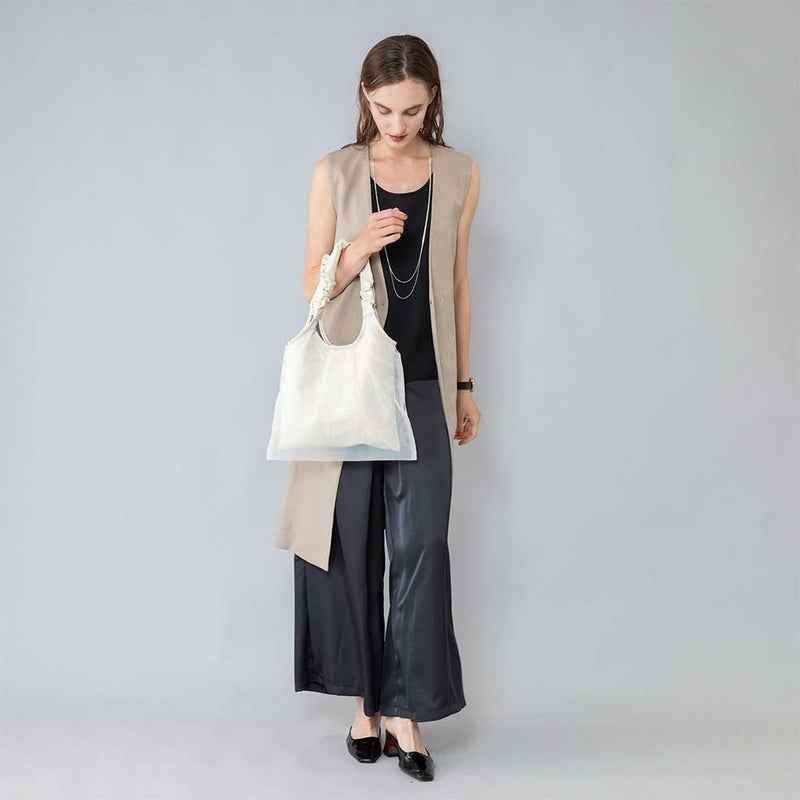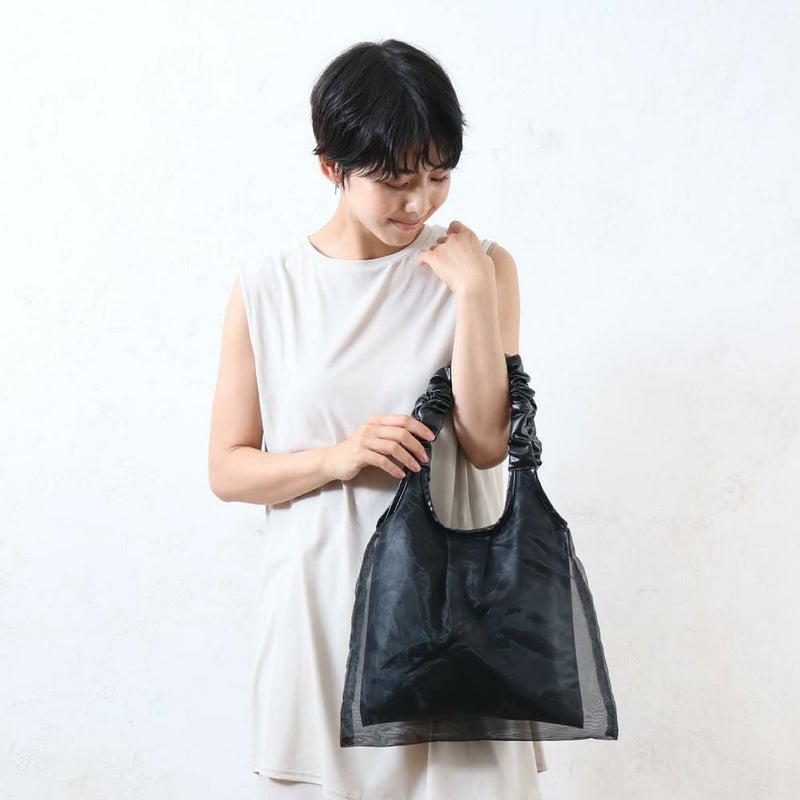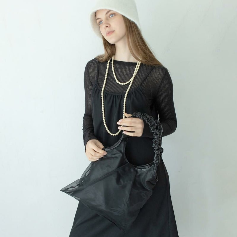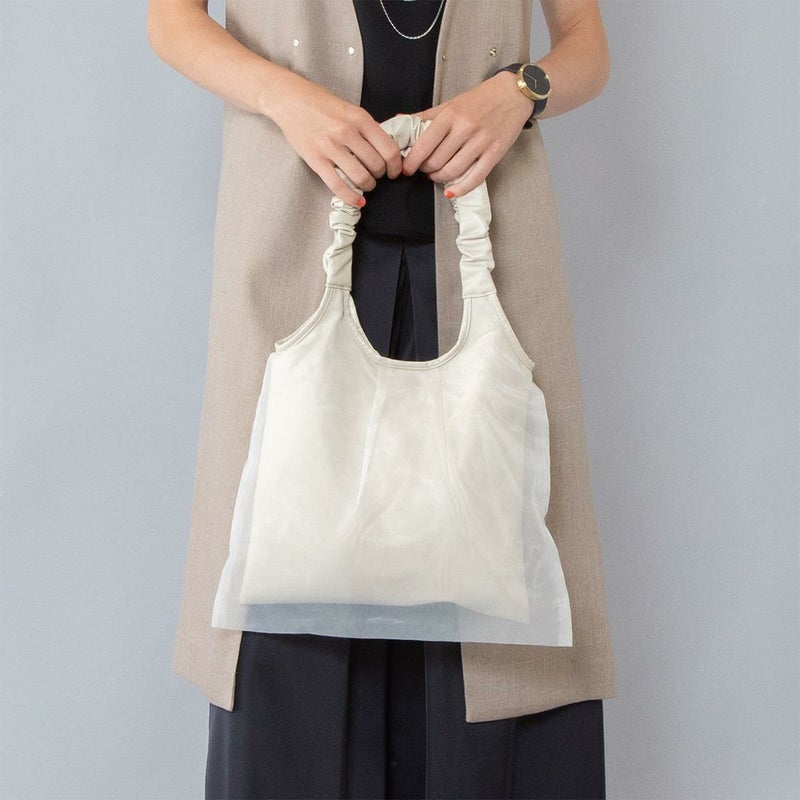 合皮とチュール生地のコンビ使いが印象的なギャザーハンドルチュールトート。小さいながらも大小3つのポケット装備で使い勝手も◎春夏コーデのアクセントになるアイコニックな雰囲気で、オケージョンにもおすすめです!!