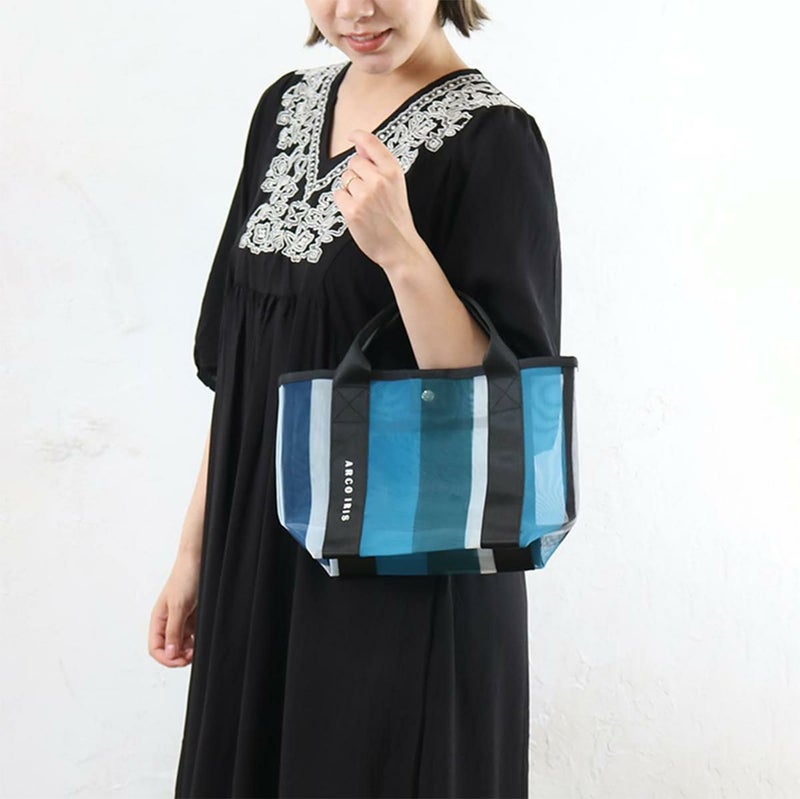カラフルな配色がこれからの季節にぴったりなプチバッグです。透け感がありつつもしっかりとしたメッシュ素材なので自立します。物を入れても変形しない底板と天面は開閉ができるマグネットつき。