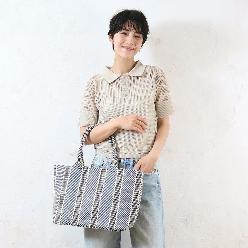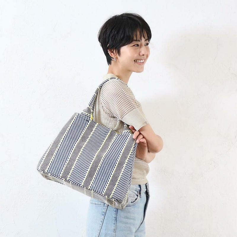 コーデのアクセントになる個性的な織り生地を使用した、A4対応サイズのサマーバッグ。ハンディファンや水筒など、暑い夏の必需品もゆったり収納できて、シャキッと自立します。サイドボタンで形状変化も楽しめる仕様で、大人の遊び心をくすぐる人気アイテムです♪