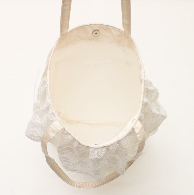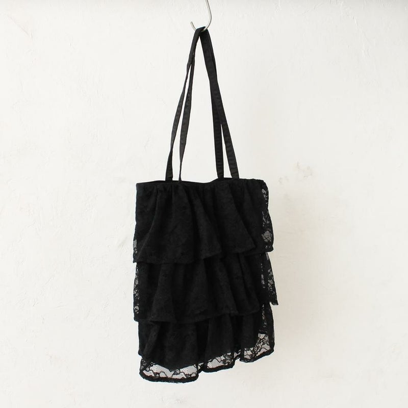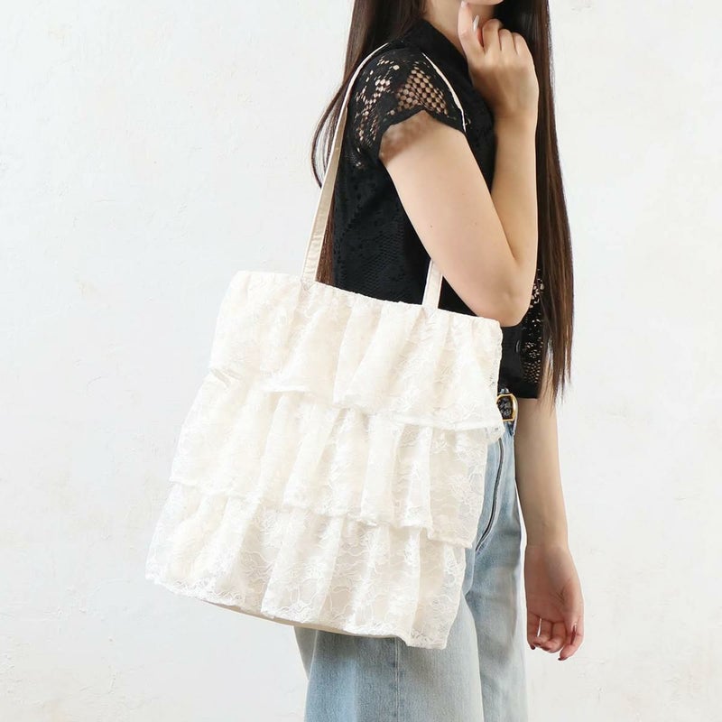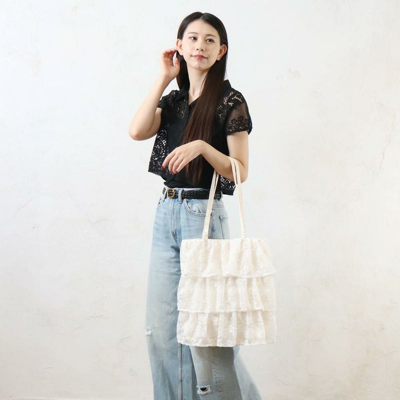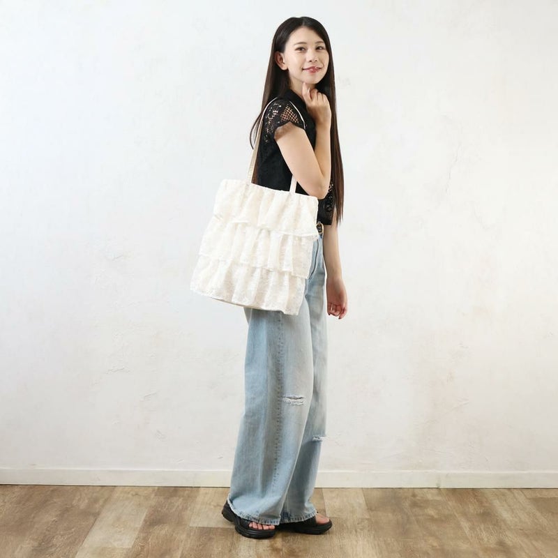 繊細なレースと何層にも重なったフリルが、コーディネートを華やかに彩るトートバッグです。ふんわりとしたボリューム感が、女性らしさを引き立てます。シンプルなスタイリングに合わせるだけで、一気にフェミニンな雰囲気に。カジュアルなデニムスタイルに甘さをプラスしたい時にもおすすめです。