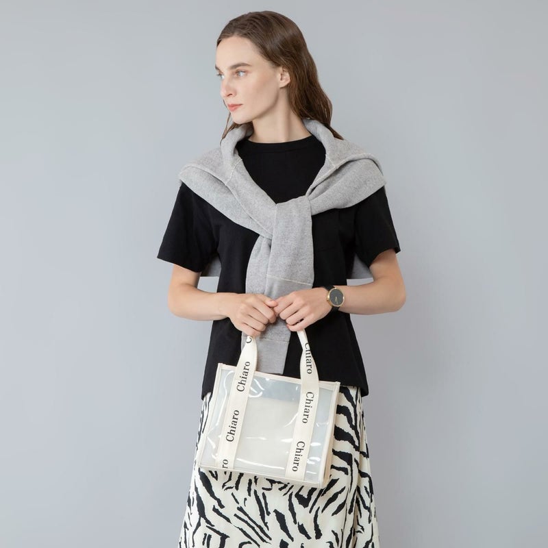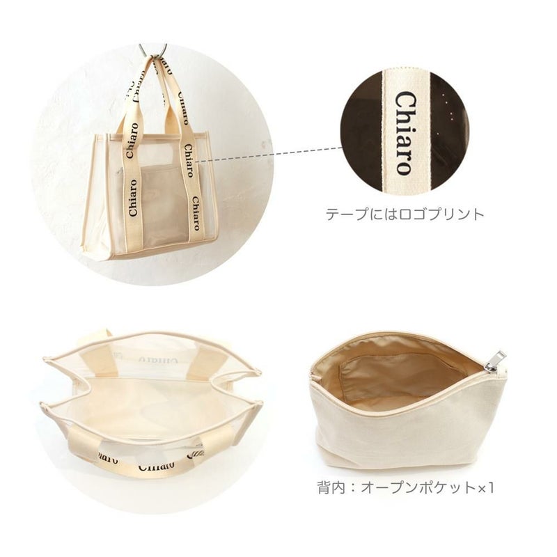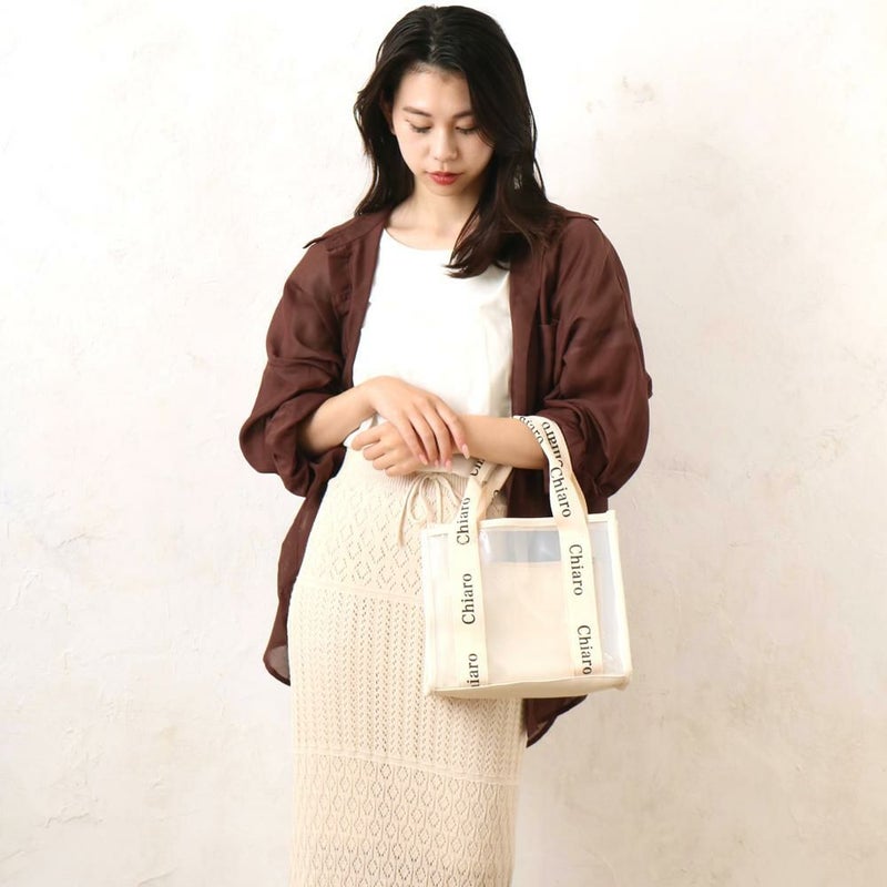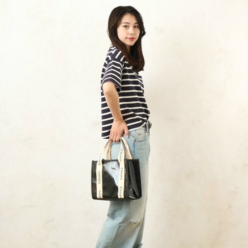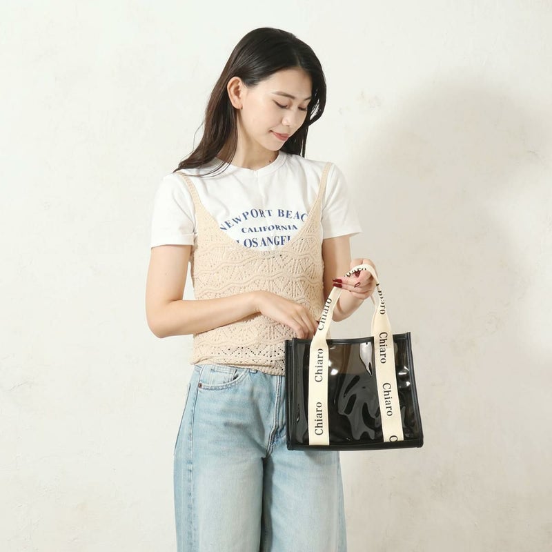 透明感のあるPVC素材と、ロゴ入りのテープハンドルを組み合わせた、トレンド感あふれるミニトートバッグです。中身を見せるデザインで、ポーチや小物を「見せる収納」として楽しむことができます。コンパクトなサイズ感ながら、マチがしっかりあるので、見た目以上の収納力があります。夏のコーディネートに抜け感と遊び心をプラスするアイテムです。