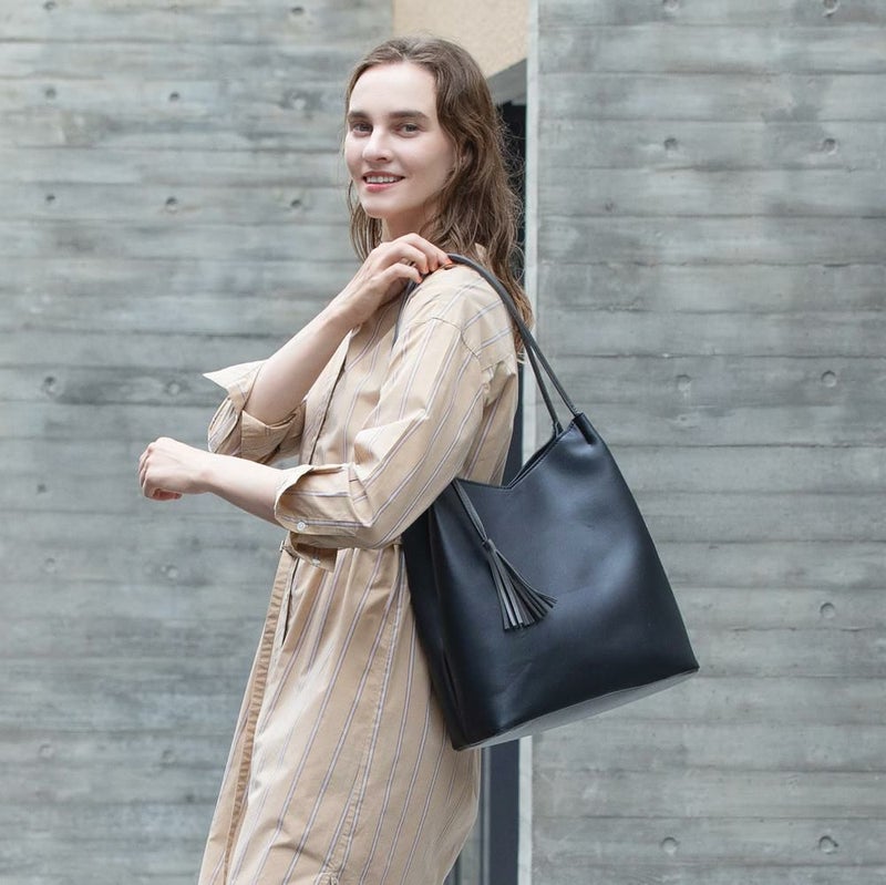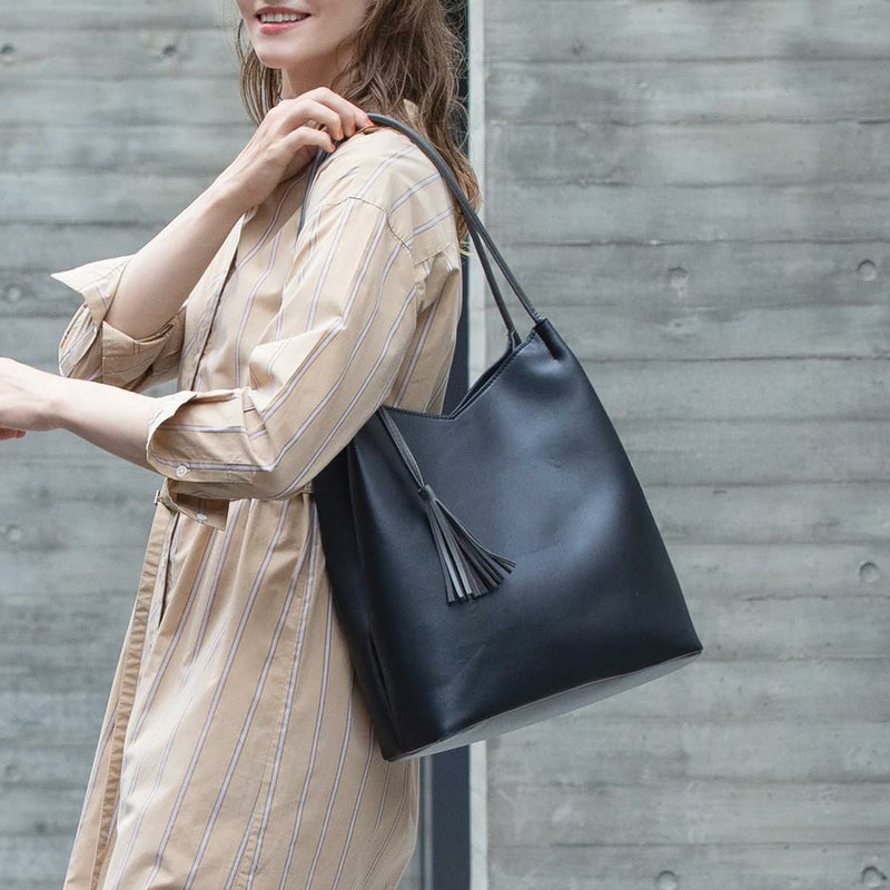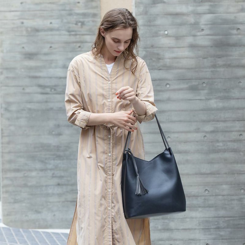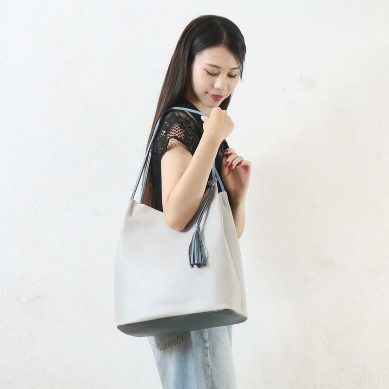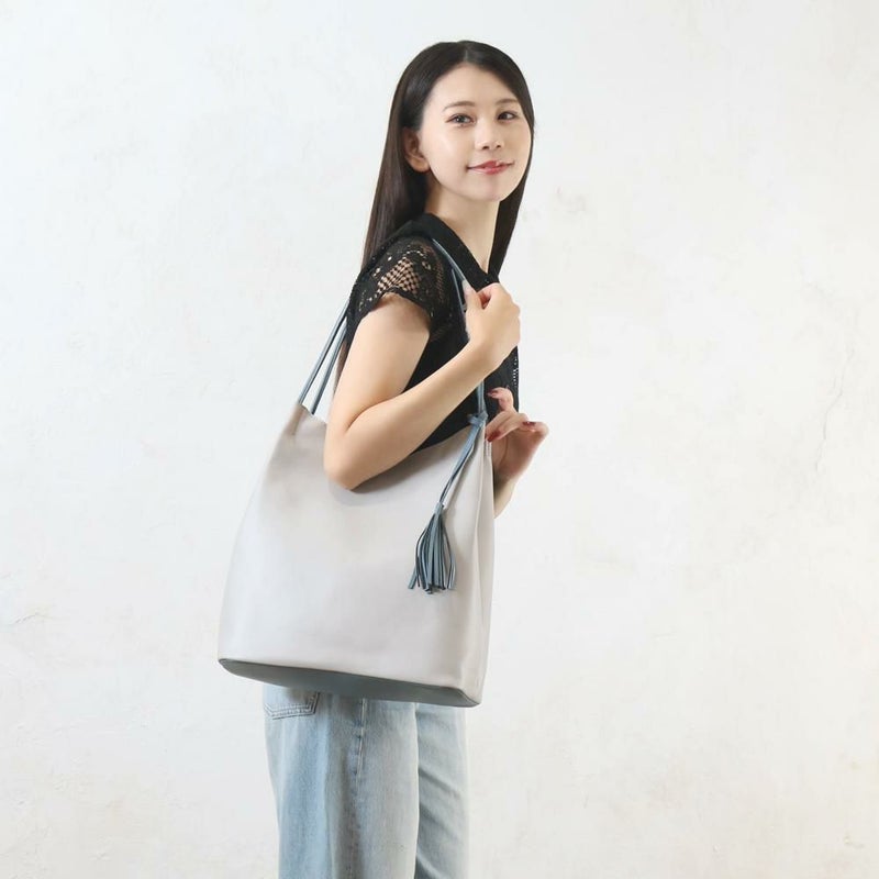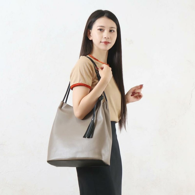 シンプルながらも洗練されたVカットデザインが特徴のトートバッグです。サイドに揺れる長めのタッセルが、コーディネートに動きと華やかさをプラスします。たっぷり入るサイズ感で機能性も抜群。取り外し可能なショルダーストラップ付きで、シーンに合わせて使い分けが可能です。