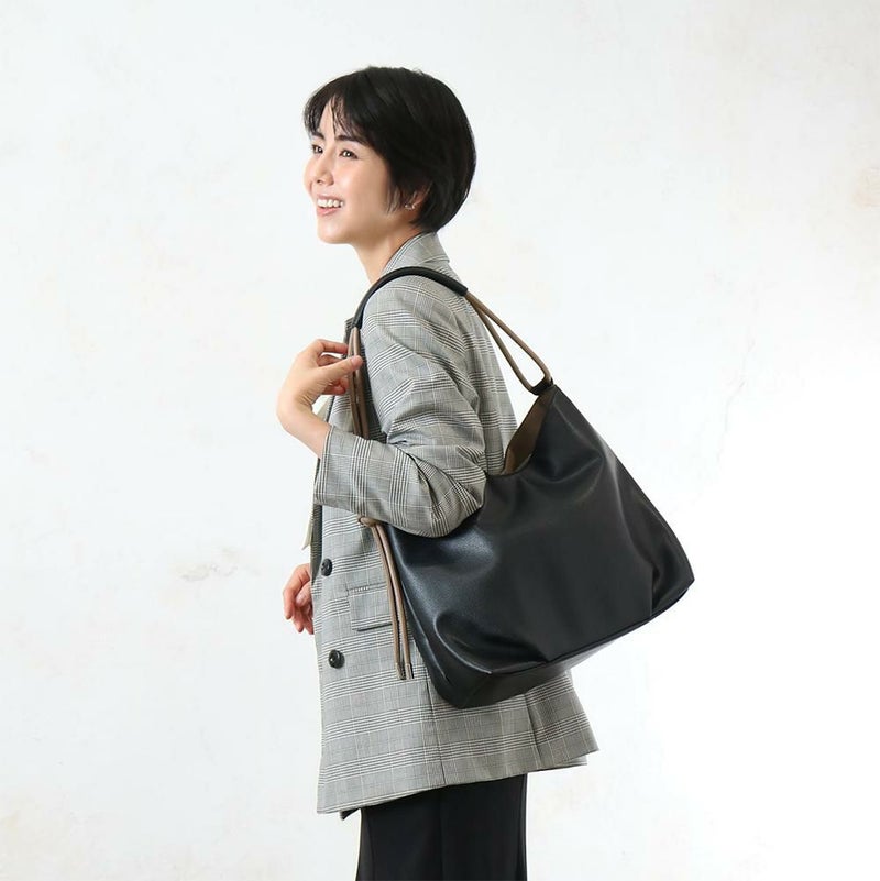 バイカラーの色使いが目を惹くA4サイズ対応のショルダーバッグ。肩にコードが食い込まない仕様で、持ちやすさにもこだわりました。柔らめの合皮ながらも自立する、ほんのり個性的な印象のショルダーバッグです。