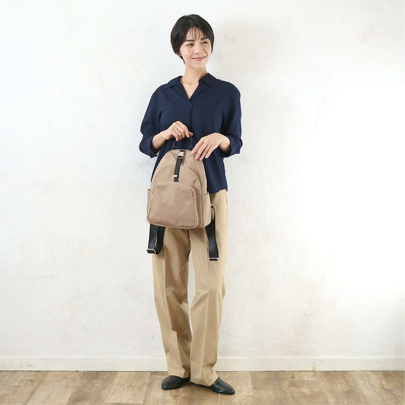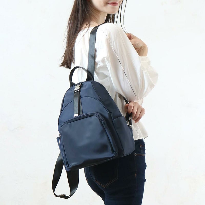 メタリックなバックルが印象的な、使いやすいミドルサイズのリュックです。様々なポケットが10個、正面マチ付きポケットの中には便利なキーフックも付いた実力派。シンプルなデザインで、年中活躍できるコーデしやすいリュックです。