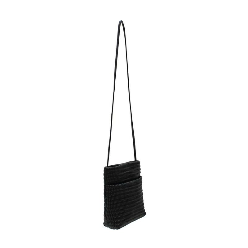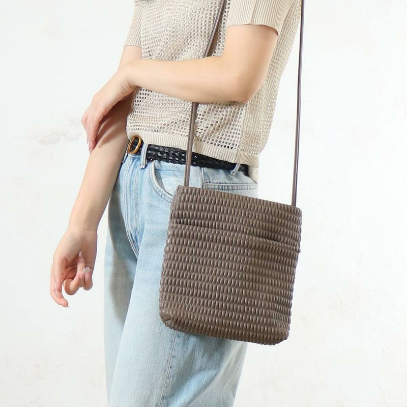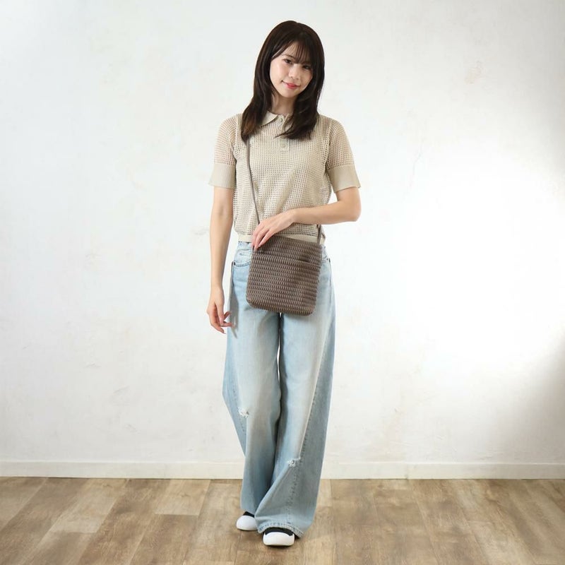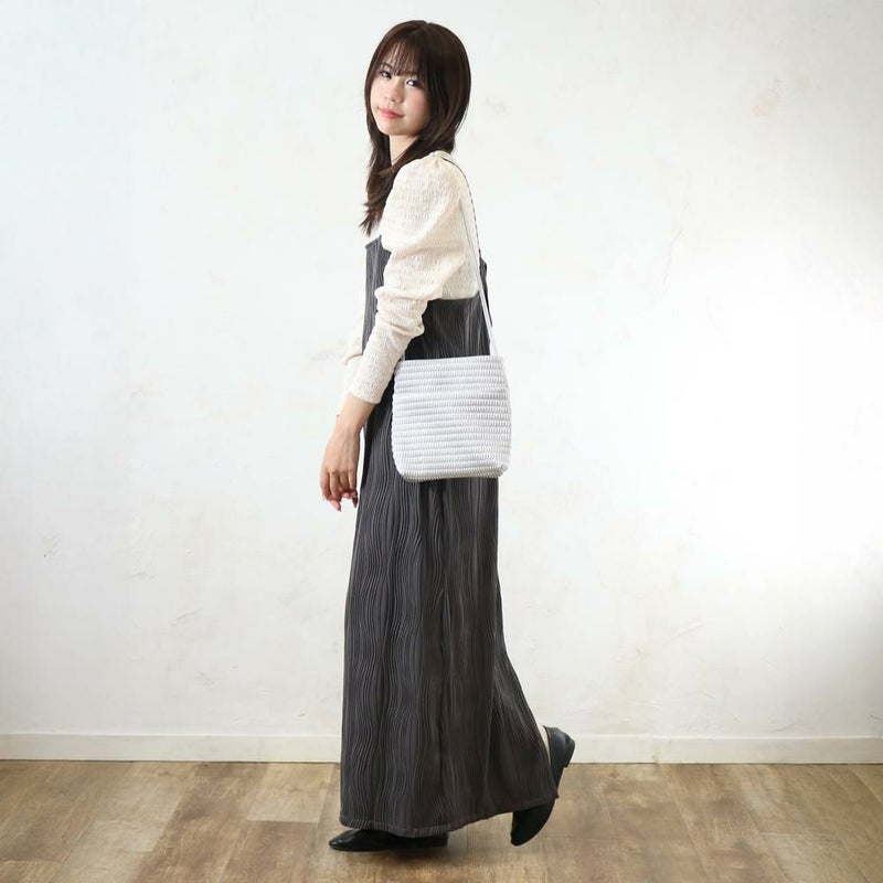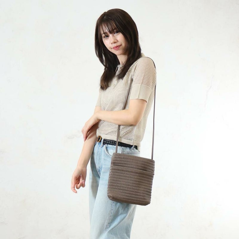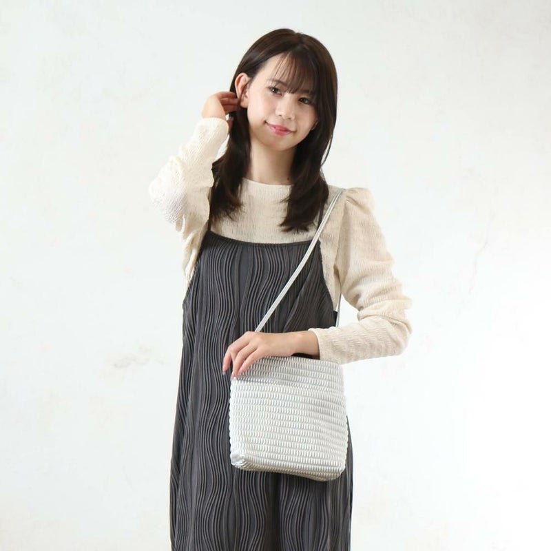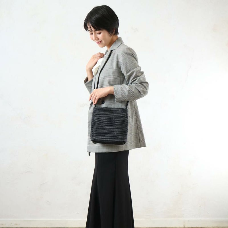 エンボス加工(型押し)を施した合成皮革を使用し、エレガントさと機能性を両立させたショルダーバッグです。正面のポケットがデザインのアクセントになるとともに、高い収納力と使いやすさを実現しています。長さ調整が可能なショルダーストラップにより、斜め掛けやワンショルダーなど、スタイルやシーンに合わせた持ち方が可能です。