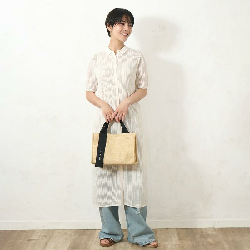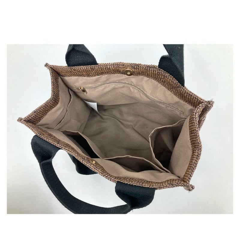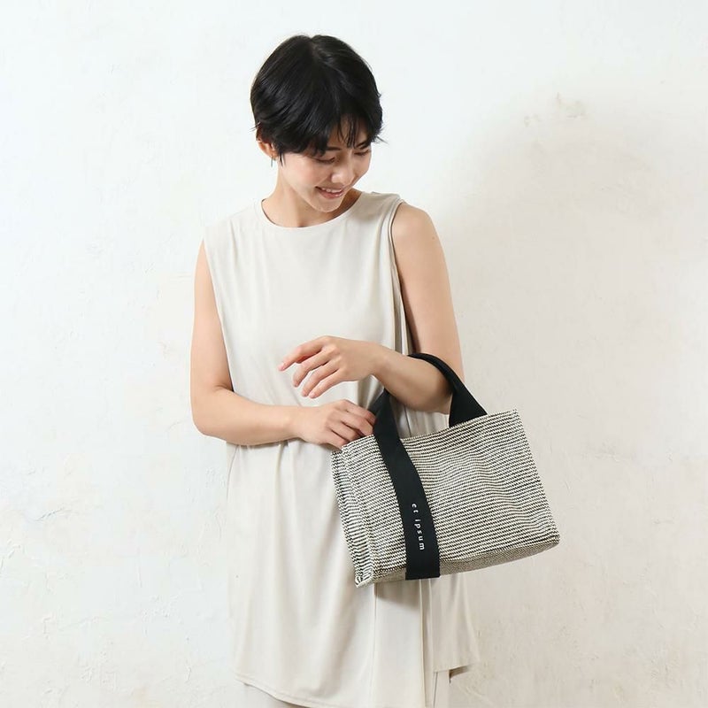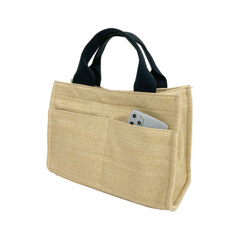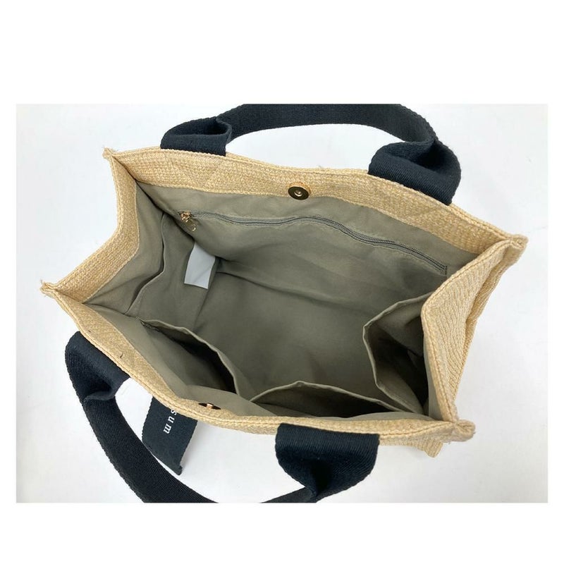 涼しげな印象の雑材風のポリ生地を使用した、アシンメトリーなハンドルが目を引くトートバッグ。大小6個のポケットと、ボトルや傘などの収納に便利なホルダー付きで、夏の必需品をまるっと収納!少しシックな印象の内装色で様々なコーデに合わせやすい、夏におすすめのトートです♪ #0216