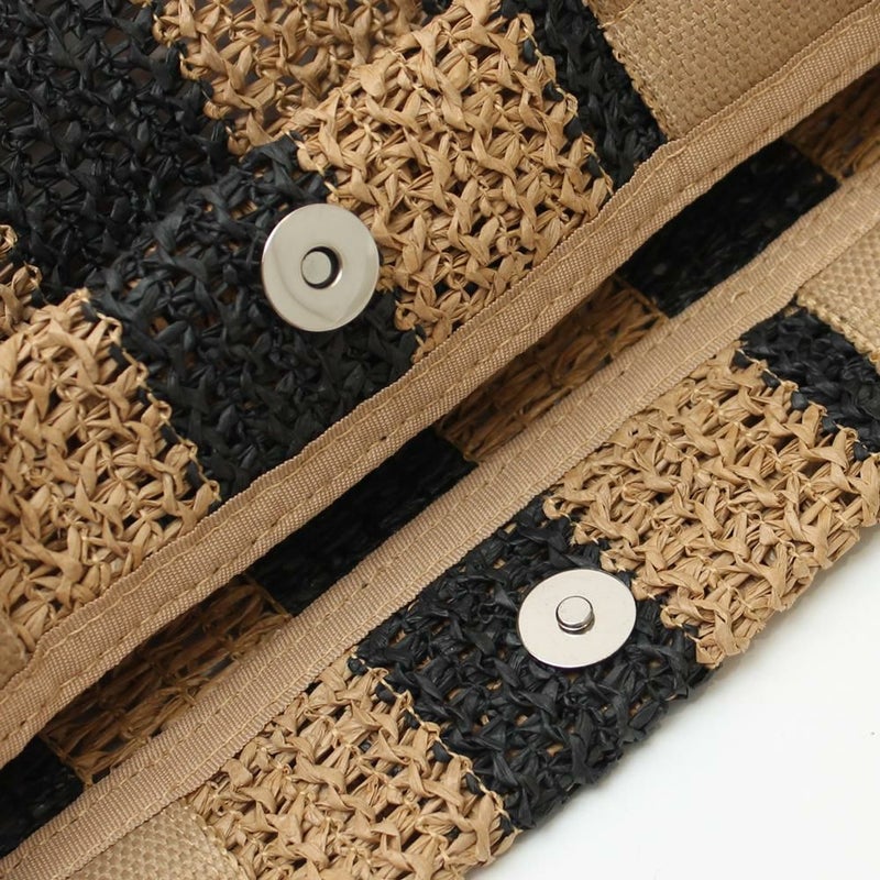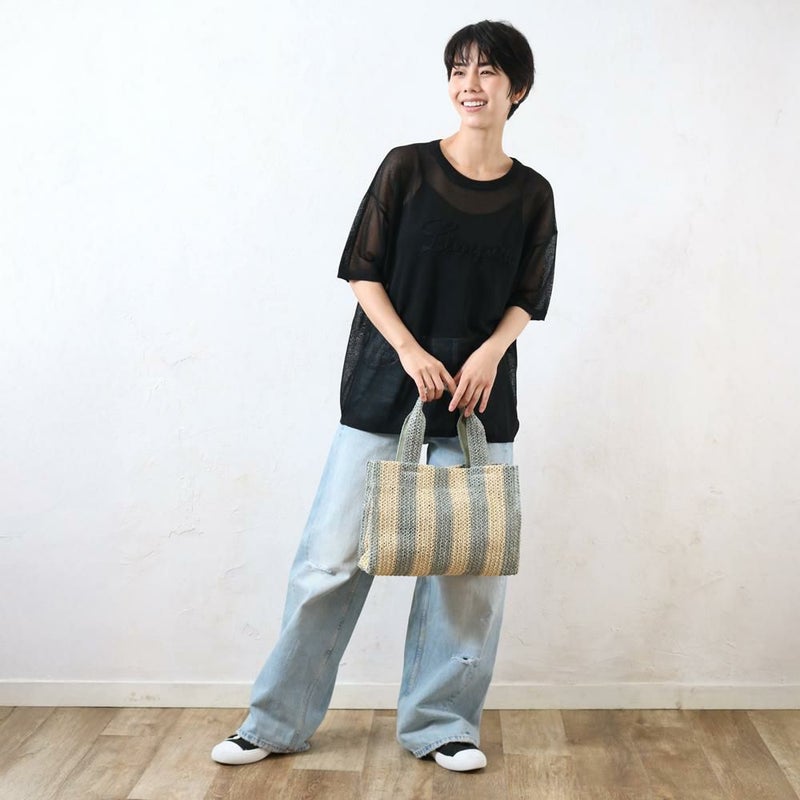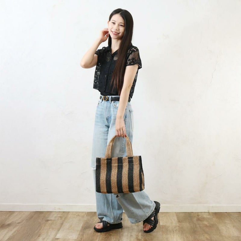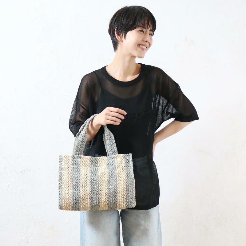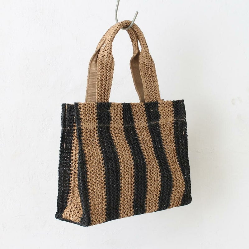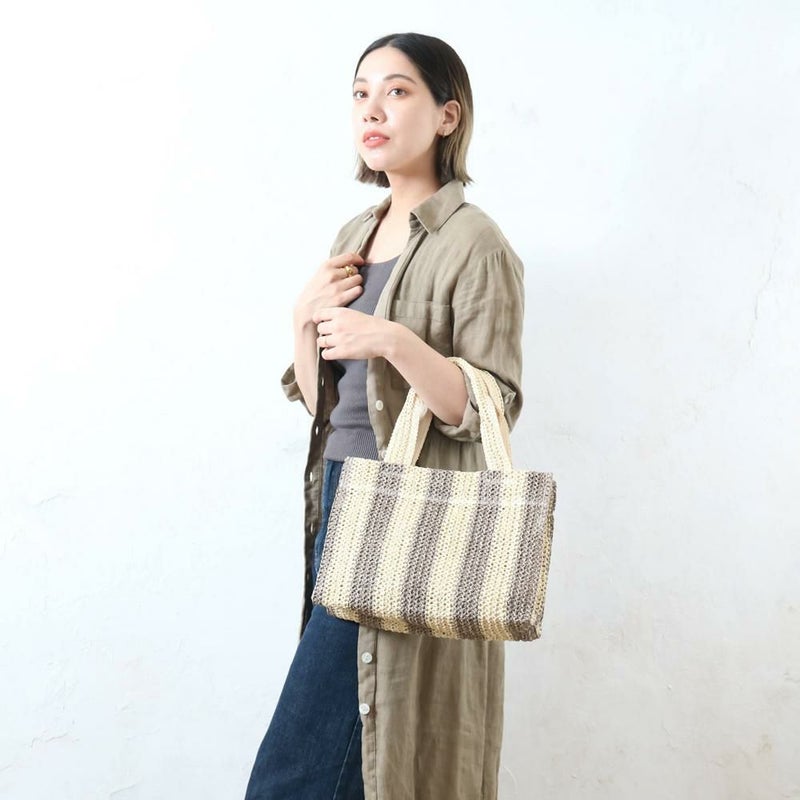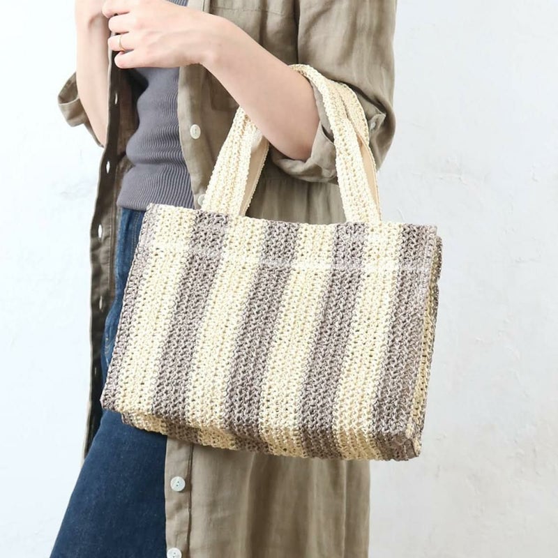 ナチュラルな素材と太めのボーダー柄が特徴の、ミニサイズのトートバッグです。素材の持つざっくりとした風合いと、爽やかなボーダー柄が、コーディネートに軽快なアクセントを加えてくれます。コンパクトな見た目ながらも、底マチがしっかりあるので、お財布やスマートフォン、ポーチなど、ちょっとしたお出かけに必要なものがきちんと収まります。