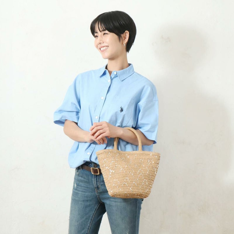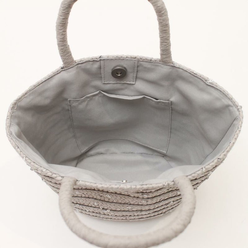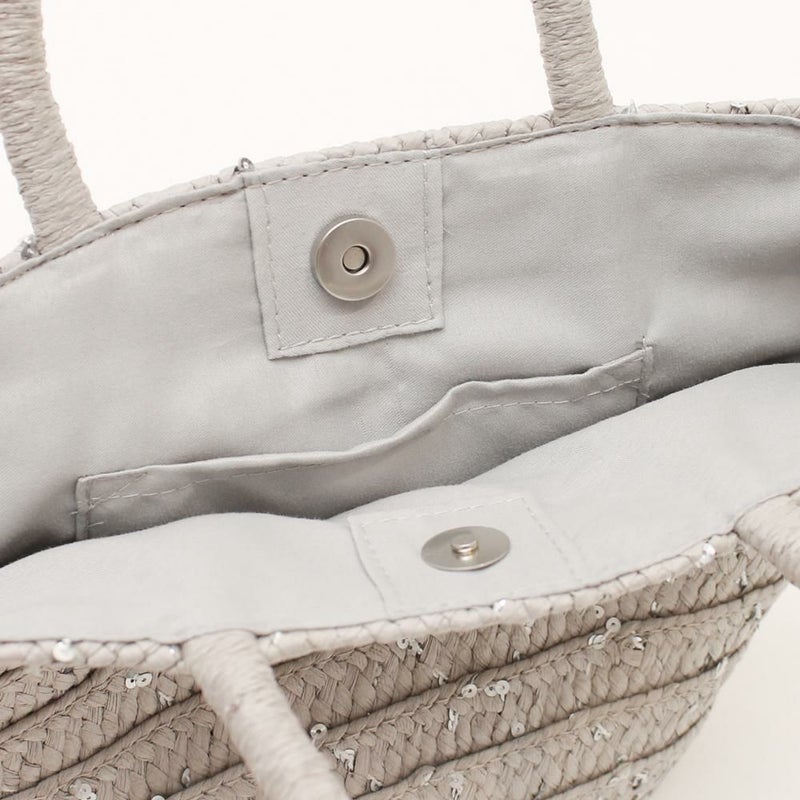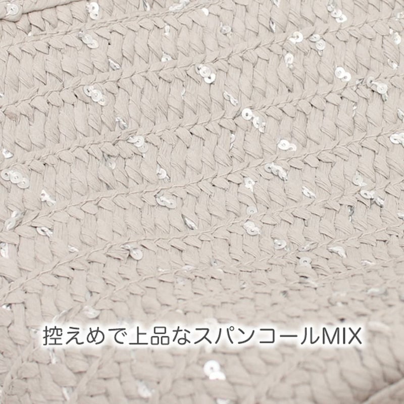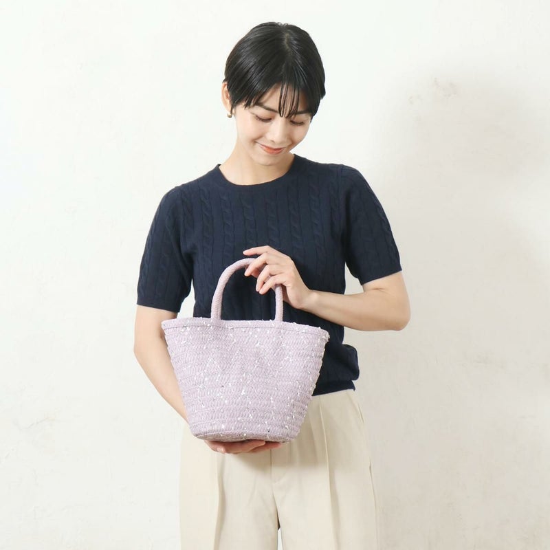 ナチュラルな雑材に、きらめくスパンコールをミックスしたミニサイズのトートバッグです。上品なパープルとスパンコールの輝きが、コーディネートに華やかさをプラスしてくれます。コンパクトな見た目ながらも、お財布やスマートフォン、リップなど、ちょっとしたお出かけに必要なものがきちんと収まります。軽量で持ちやすく、カジュアルなスタイルにはもちろん、きれいめなワンピースやスカートにも馴染むので、毎日のコーディネートのアクセントとして活躍します。