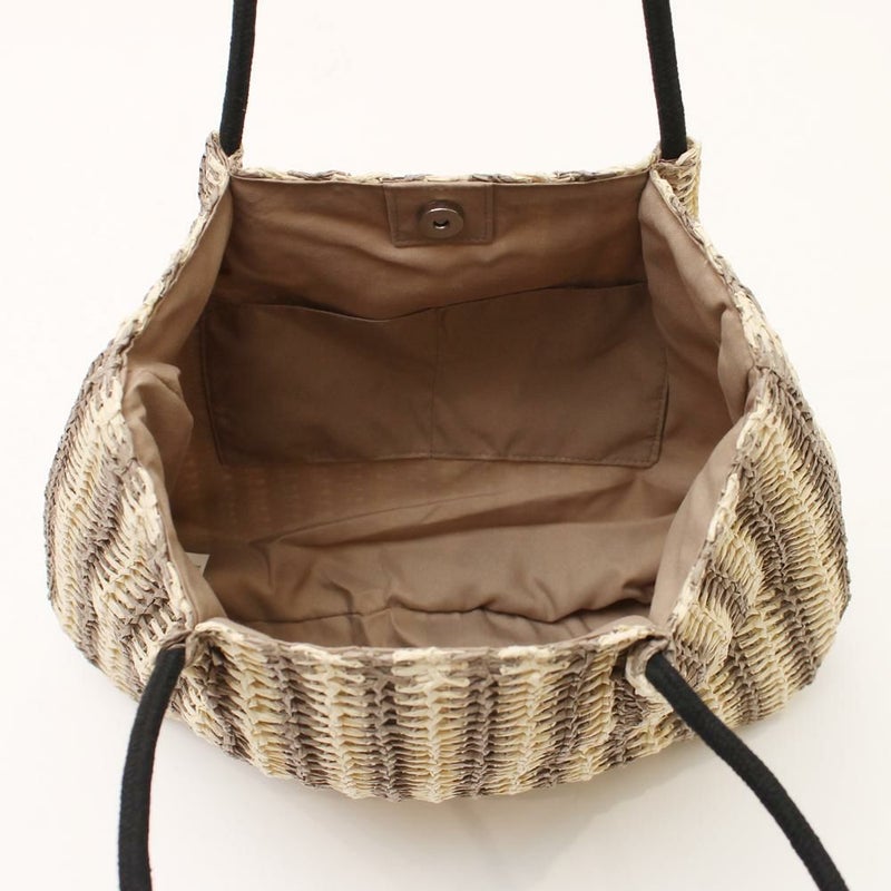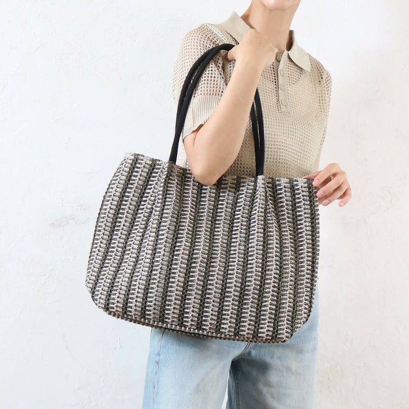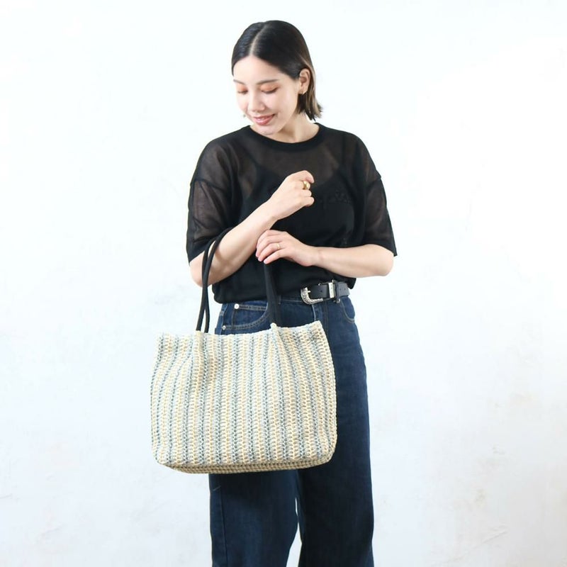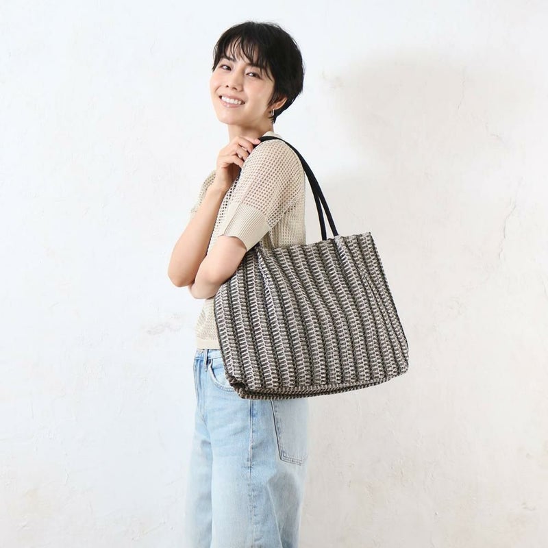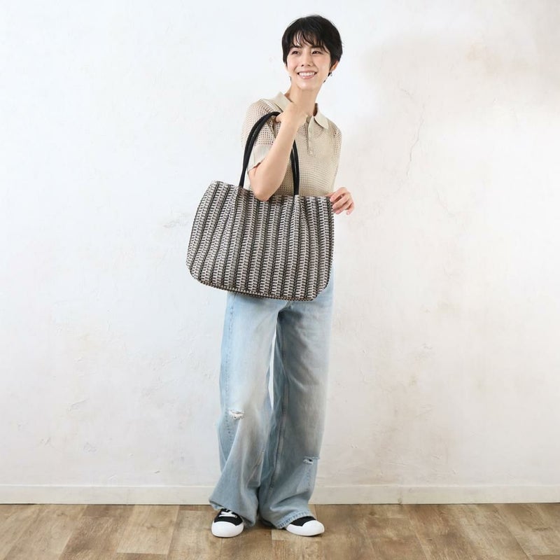ナチュラルな雑材を使い、立体的なストライプ柄に編み上げたトートバッグです。太めのストライプがコーディネートのアクセントになり、おしゃれな印象を与えます。A4サイズがすっぽり入る大きめサイズで、収納力は抜群。普段使いはもちろん、通勤・通学や小旅行にも便利です。