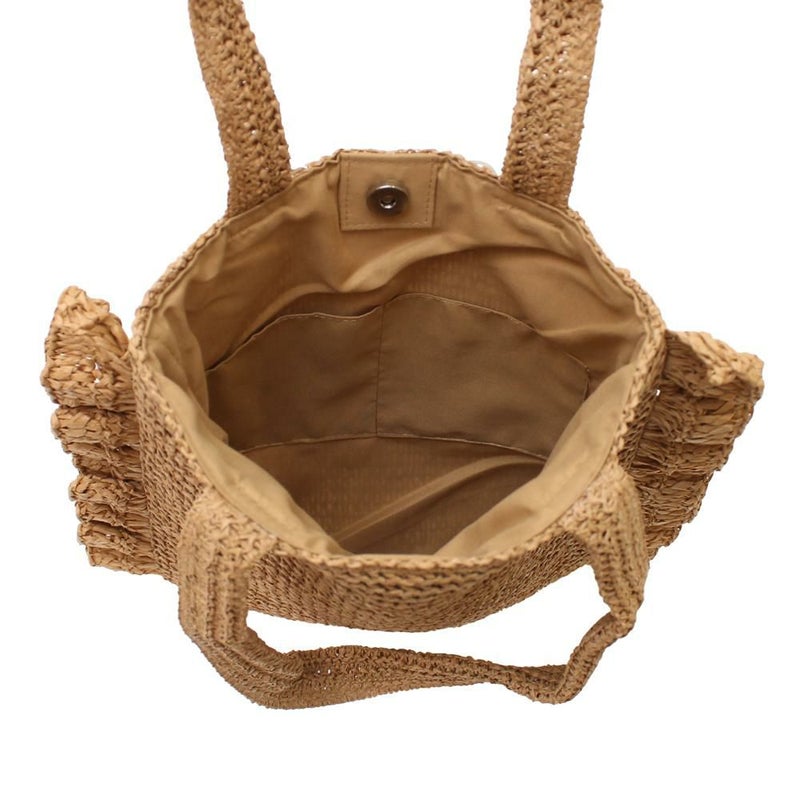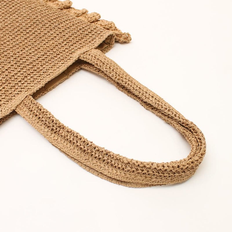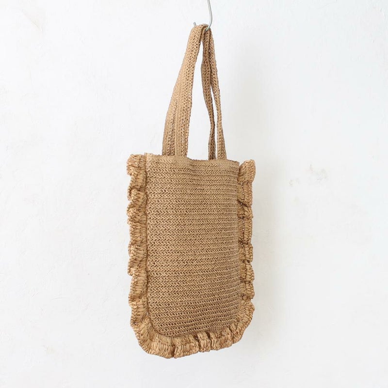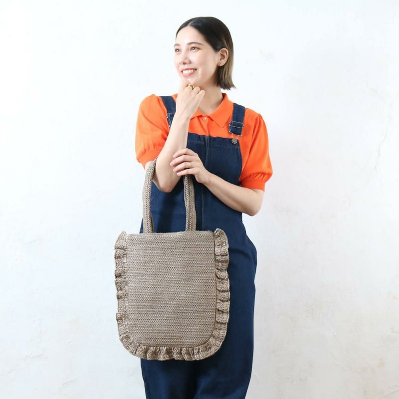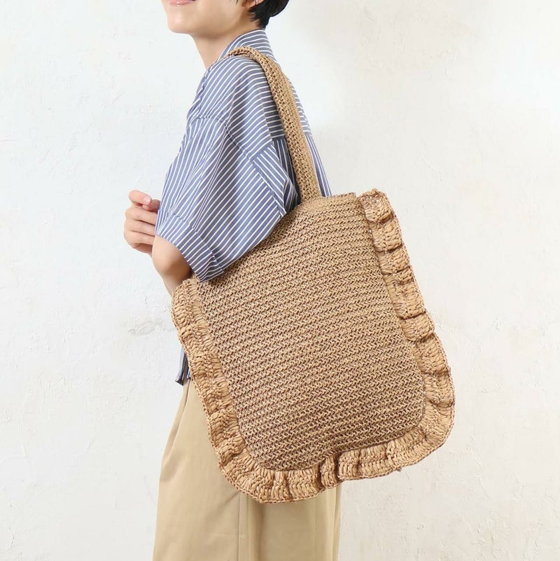 ラッフルフリルをあしらったトートバッグです。縁にあしらわれた波打つようなフリルが、シンプルながらもフェミニンで可愛らしい印象を与えます。A4サイズもすっぽり入る大きめサイズで、収納力は抜群。普段使いはもちろん、通勤・通学やマザーズバッグとしても活躍します。カジュアルなTシャツやデニムスタイルに合わせると、コーディネートに甘さをプラス。