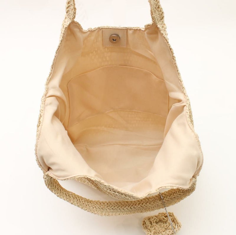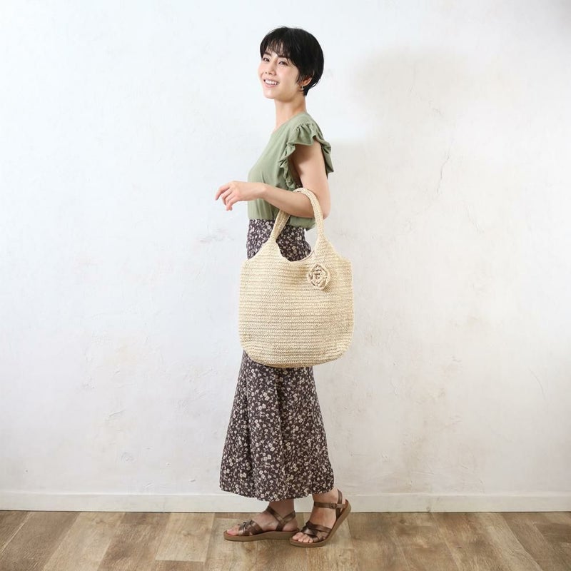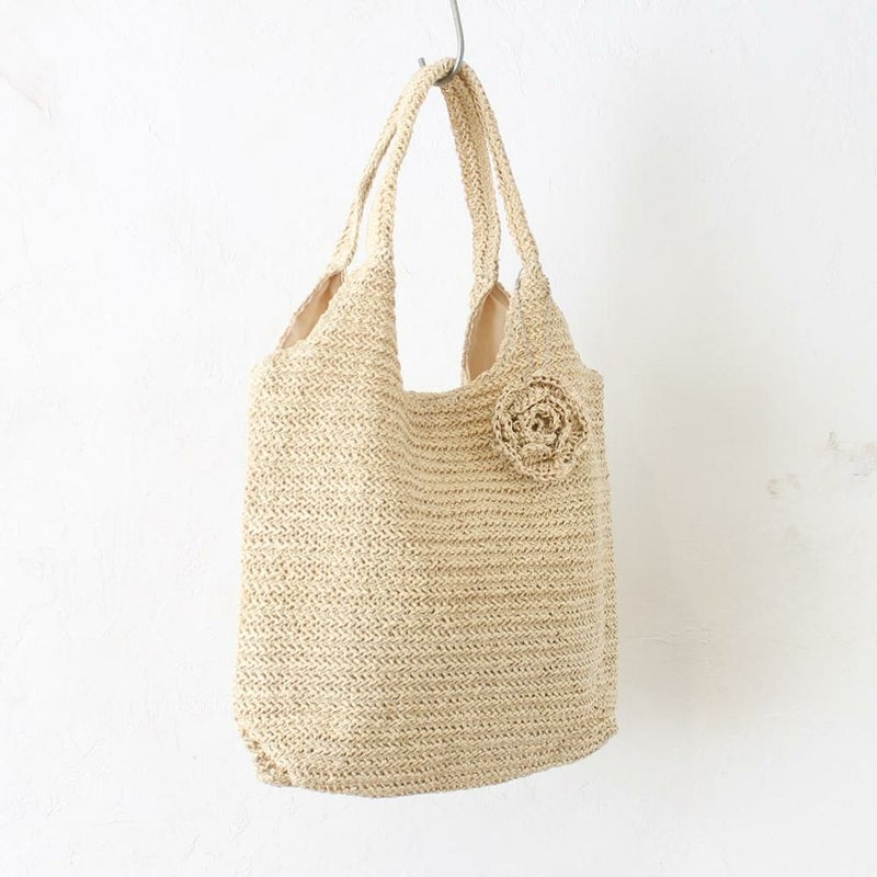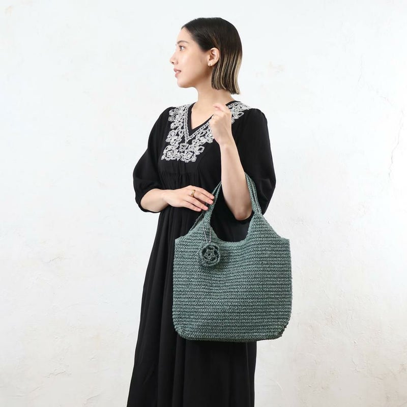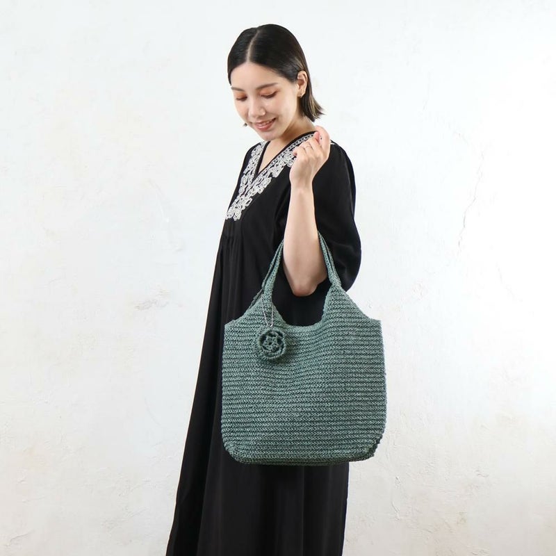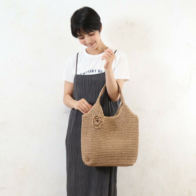 立体的なお花のモチーフが付いた、フラワーチャーム付きのクリテトートバッグです。ざっくりとした編み目が、コーディネートに優しい雰囲気を加えてくれます。使いやすいサイズ感で、マチも広めなので、荷物が多い日でも安心です。普段使いはもちろん、お仕事やちょっとした旅行など、様々なシーンで活躍します。
