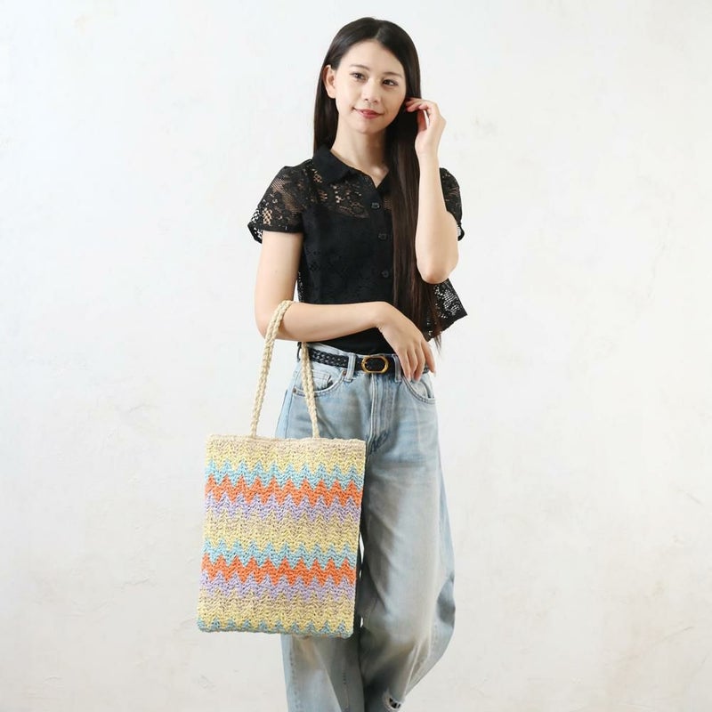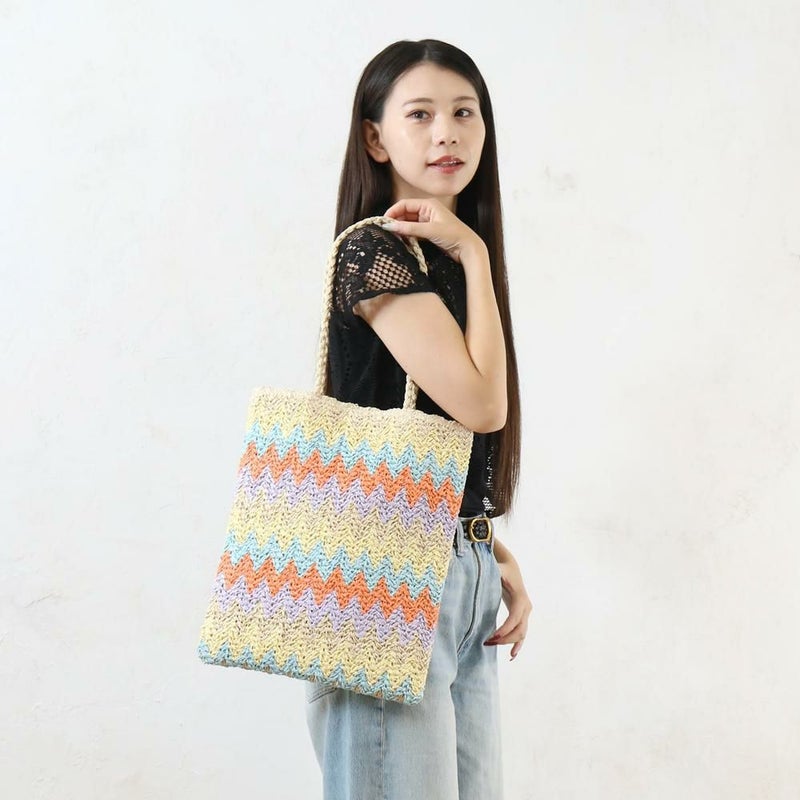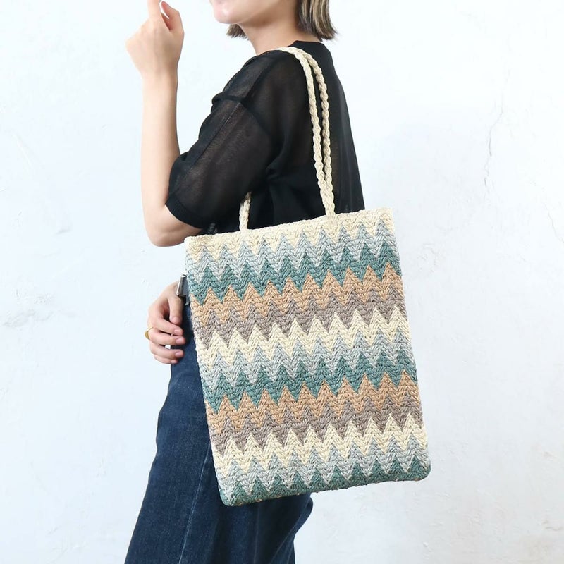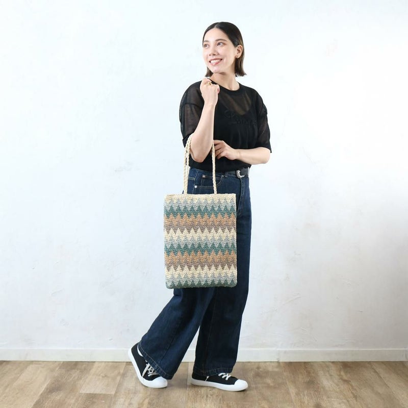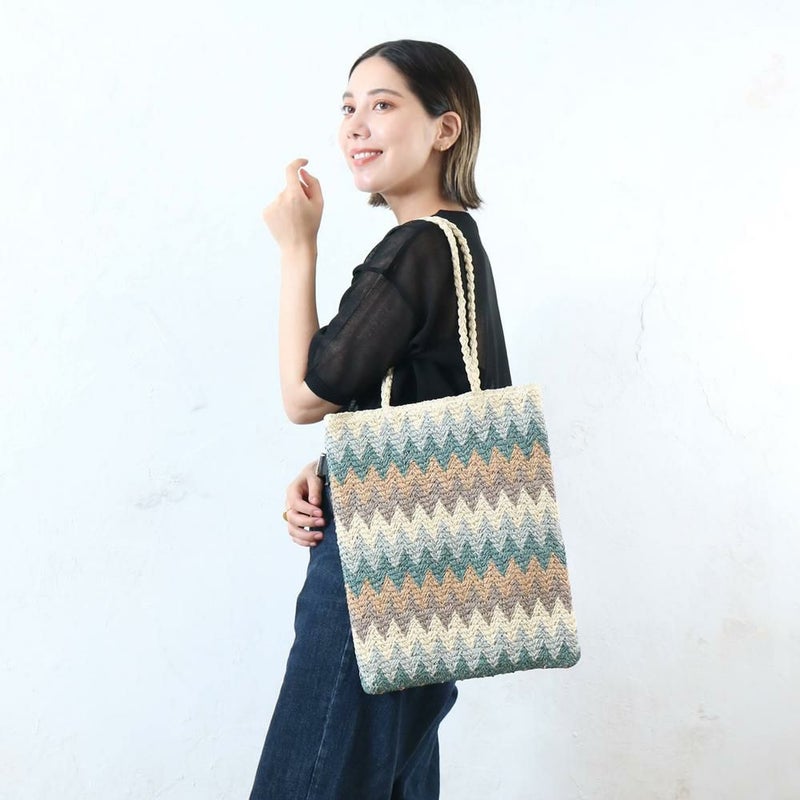ギザギザ模様が特徴のトートバッグです。ざっくおり、コーディネートの主役になります。肩掛けもしやすくA4サイズもすっぽり入る大容量で、普段使いはもちろん、通勤・通学やサブバッグとしても活躍します。カジュアルなTシャツやデニムスタイルと合わせると、バッグの柄が引き立ちます。シンプルな服装に合わせるだけで、一気に華やかでおしゃれな印象に仕上がります。