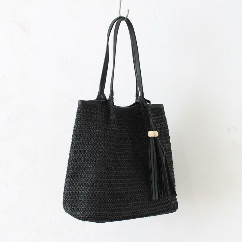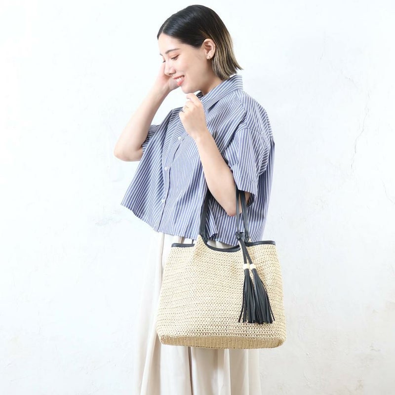 フリンジタッセルがアクセントになり、シンプルながらも個性を感じさせるデザインです。広めの底マチで、お財布やポーチ、500mlペットボトルなど、お出かけに必要なものがしっかり入ります。