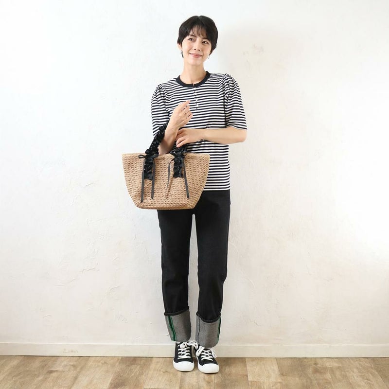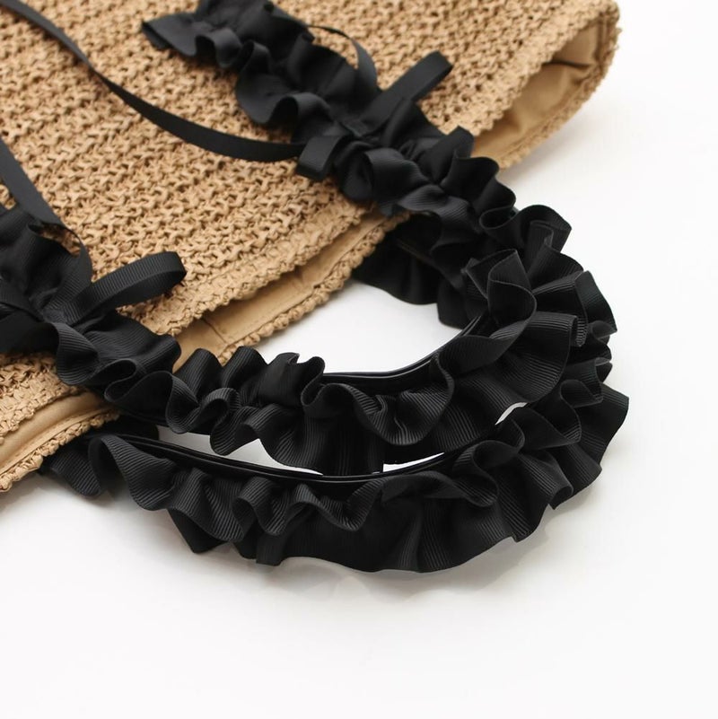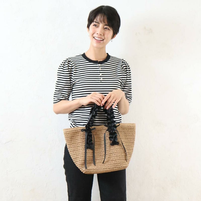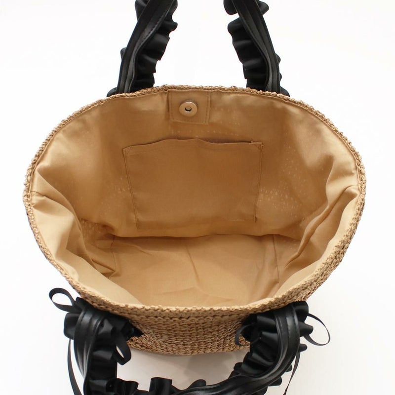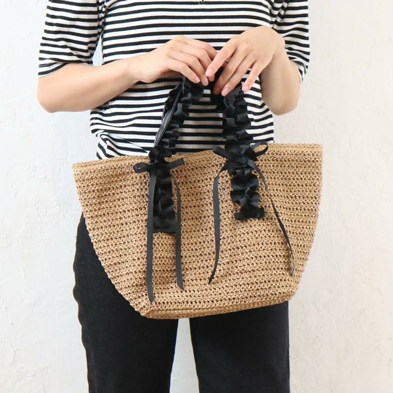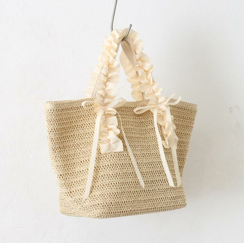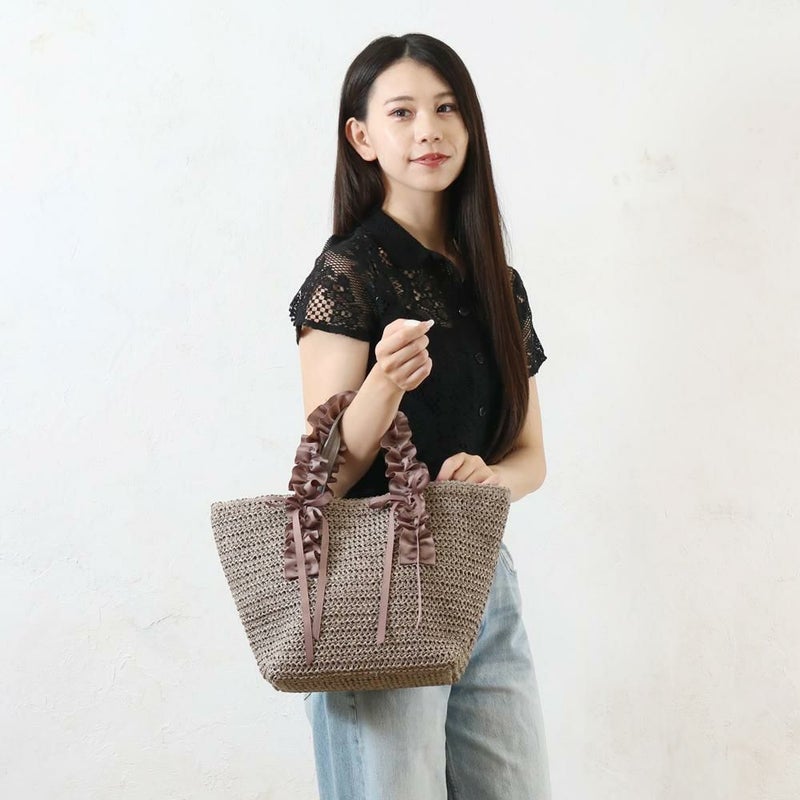 春夏ムードを一気に高めてくれる大人らしく上品なフリルデザイン!ナチュラルな雑材に、フリルとリボンをあしらったトートバッグです。フリルとリボンが持ち手部分に施されており、シンプルながらもフェミニンで可愛らしい印象を与えます。デイリー使いから浴衣に合わせたり、リゾートシーンまでどんなスタイルにも合わせやすくコーデのワンポイントに活躍してくれるアイテムです◎