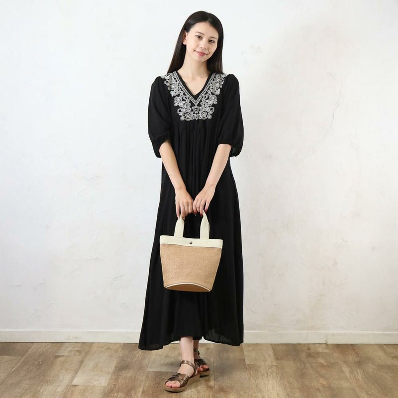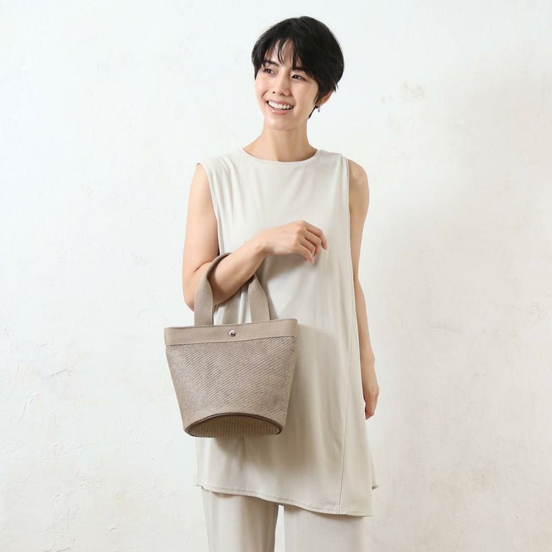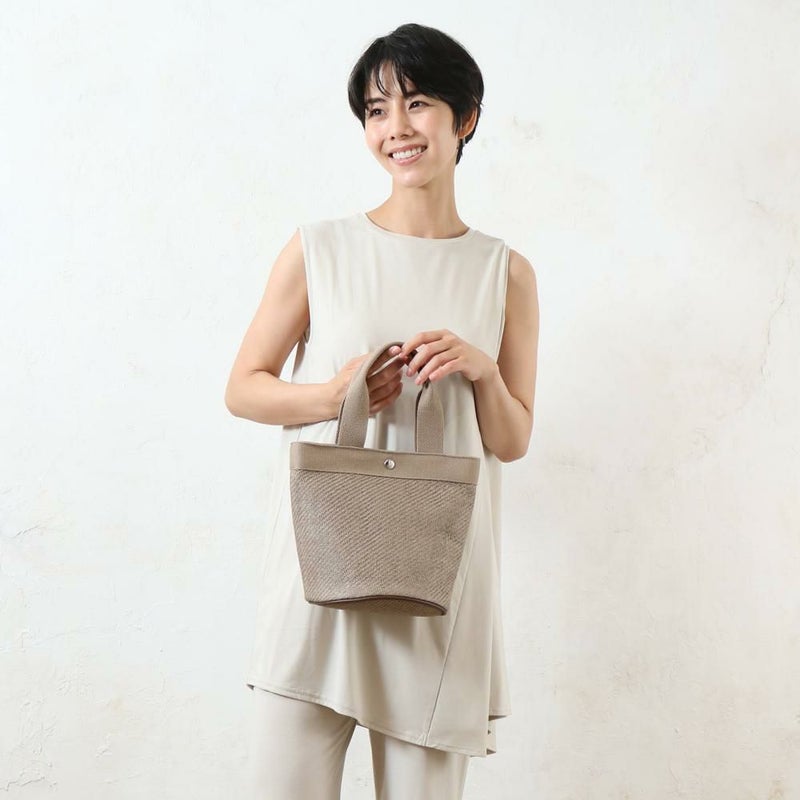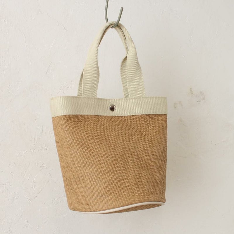 ナチュラルな雑材と、しっかりとしたレザー調のテープハンドルが特徴のバケツ型トートバッグです。異素材の組み合わせが、シンプルながらも洗練された印象を与えます。財布やポーチ、500mlペットボトルなど、お出かけに必要なものがすっきりと収まります。デイリーユースにぴったりのサイズ感で、様々なシーンで活躍します。