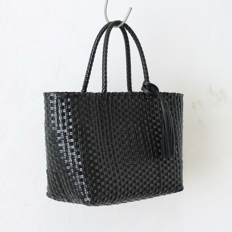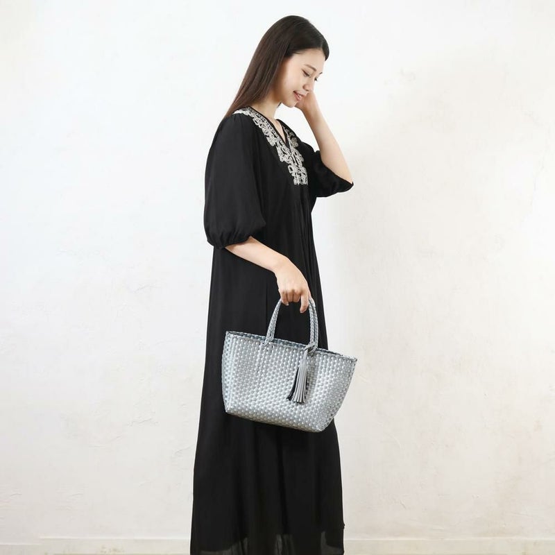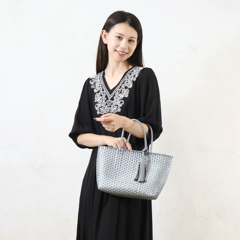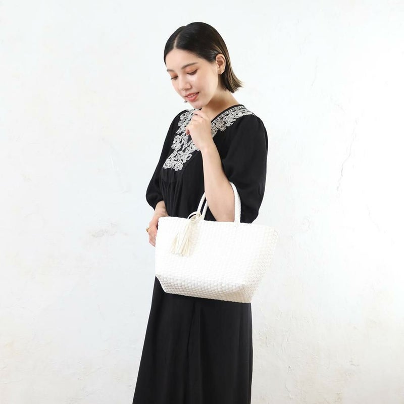 お手持ちの荷物をすっきり収納できる、タッセル付きメルカドバッグ。編み込みデザインが涼しげな印象を与え、季節感を演出します。取り外し可能なタッセルチャームが、遊び心をプラス。シンプルながらも上品なアクセントになります。軽量で丈夫な素材。柔軟性があり、耐久性に優れた素材を使用。水にも強く、海やプールサイドでの使用にも安心です。カジュアルな普段使いはもちろん、浴衣や着物、リゾートスタイルにも合わせやすいデザインです。