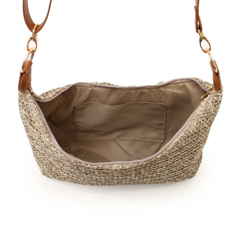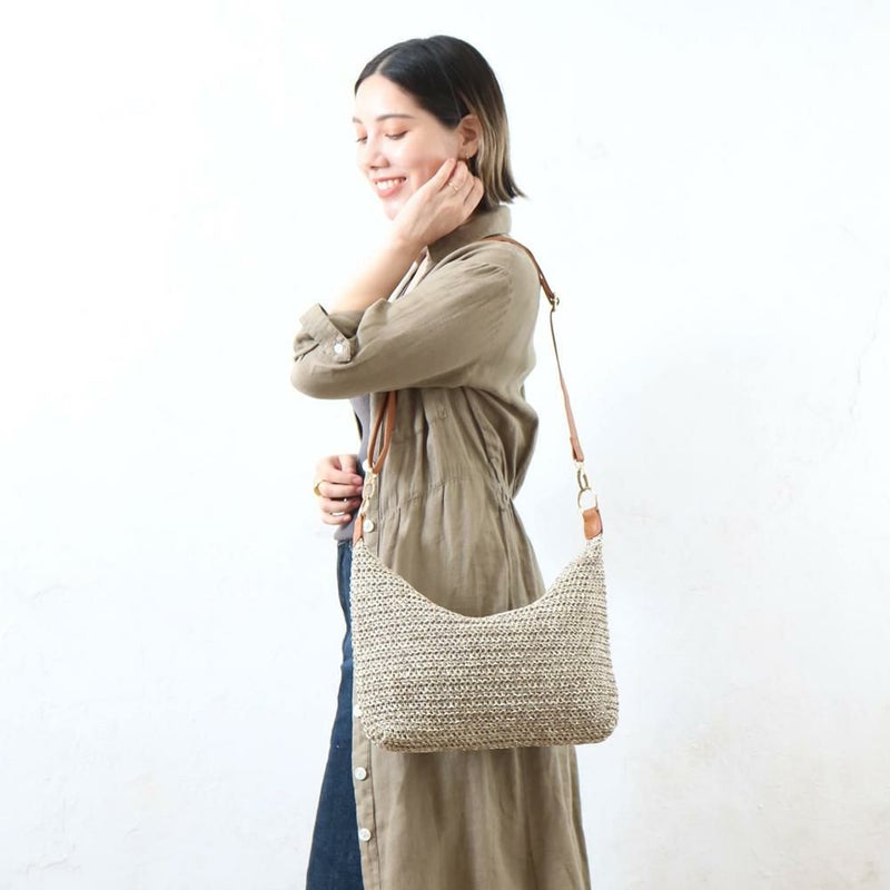 清涼感あふれる雑材の編み込みが、夏らしいショルダーバッグです。ざっくりと編まれた雑材が、涼しげで軽やかな印象を与えます。長財布やスマートフォンなど、お出かけに必要なものがしっかりと収まるサイズです。シンプルなデザインなので、カジュアルなTシャツスタイルから、ワンピースまで、様々なコーディネートに合わせやすいです。ショルダータイプなので、両手が空き、身軽にお出かけを楽しめます!
