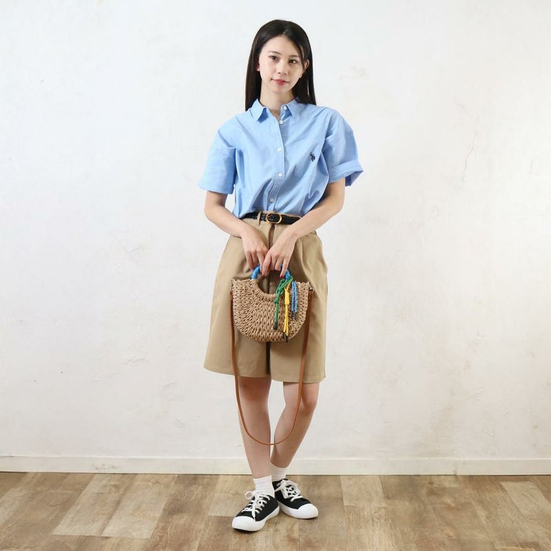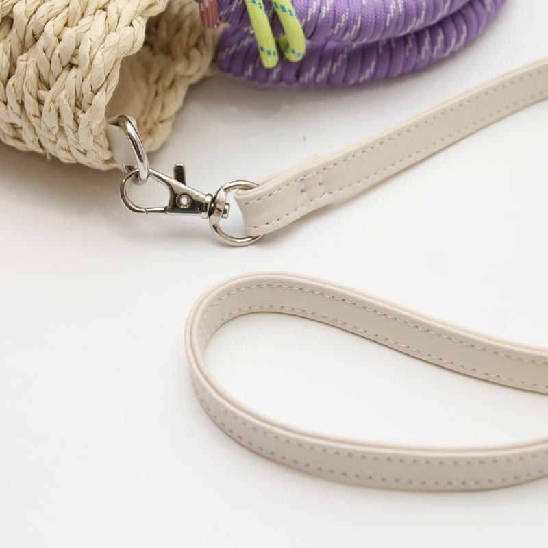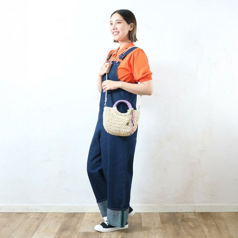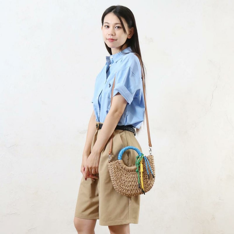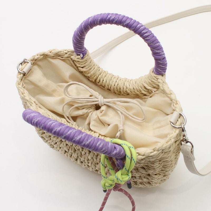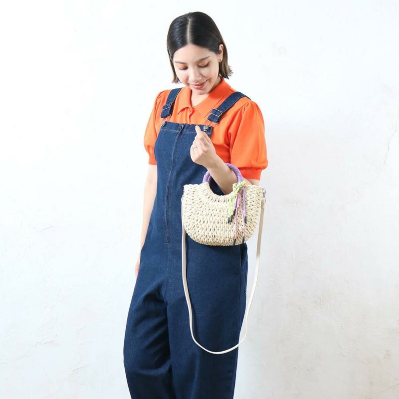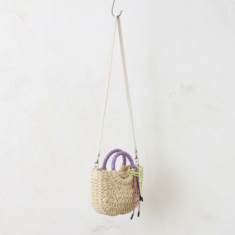 ざっくりと編まれた雑材に、カラフルなコードストラップとハンドルがアクセントになっています。ミニ財布やスマートフォンなど、お出かけに必要なものがしっかりと収まるサイズです。カジュアルなコーディネートはもちろんワンピースなど、様々なスタイルにマッチします。ショルダータイプなので、両手が空き、身軽にお出かけを楽しめます。
